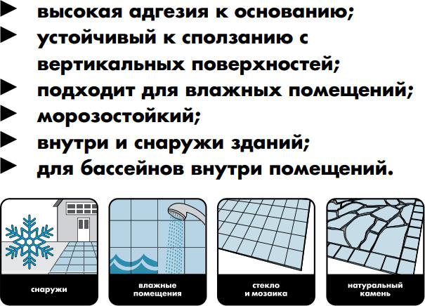 | Наружное применение, Внутреннее применение, Для влажных помещений, Бассейн, Полы, Стены | |