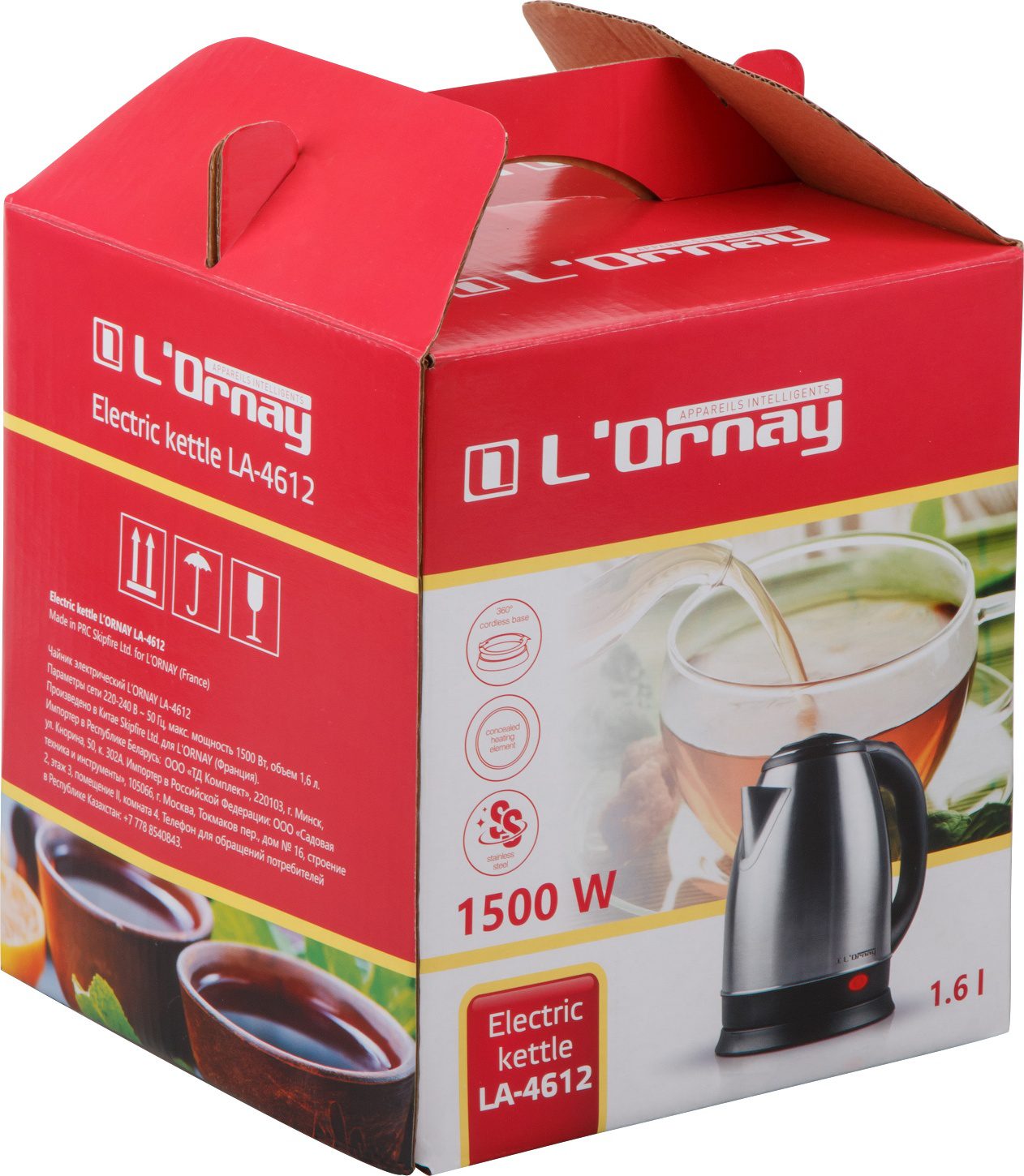 Электрочайник L’ORNAY LA-4612 предназначен для подогрева или кипячения питьевой воды. Встроенный контроллер автоматически отключит чайник при достижении воды температуры кипения. Для удобства использования прибор оборудован подставкой, за счет этого сетевой кабель не будет мешать в процессе эксплуатации. Скрытый термоэлемент обеспечивает равномерный нагрев и удобное обслуживание. Чайник можно устанавливать на подставку в любом положении (круговой контакт обеспечивает вращение на 360°).