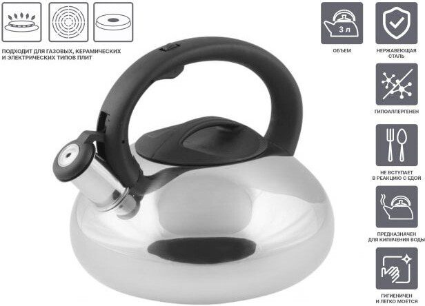 Чайник со свистком PERFECTO LINEA Ufo 3 л серебристый металлик (52-129018) изготовлен из качественной нержавеющей стали. Имеет фиксированную нескользящую ручку, выполненную из бакелита. Особенность бакелитовых ручек состоит в том, что они практически не нагреваются даже при длительном нагреве. Клапан свистка, также покрытый бакелитом, защитит руки при разливании кипятка. Специальный встроенный механизм на рукоятке позволяет легко и удобно открывать насадку-свисток одним нажатием кнопки. Встроенный свисток вовремя оповестит Вас о закипании воды. Хорошо зафиксированная и плотно прилегающая крышка дольше сохранит тепло.
