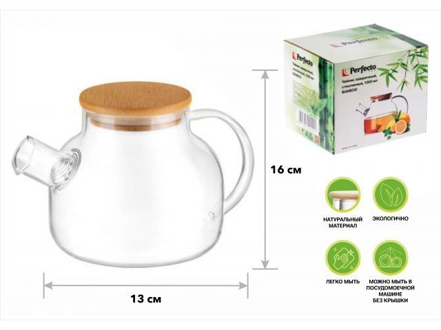 Заварочный чайник стеклянный PERFECTO LINEA Bamboo 1,0 л предназначен для заваривания горячих напитков. Корпус выполнен из боросиликатного стекла, способного выдерживать нагревание до 100 °С, металлические части из нержавеющей стали, а также имеются детали из бамбука и силикона. Стеклянный корпус можно мыть в посудомоечной машине.
