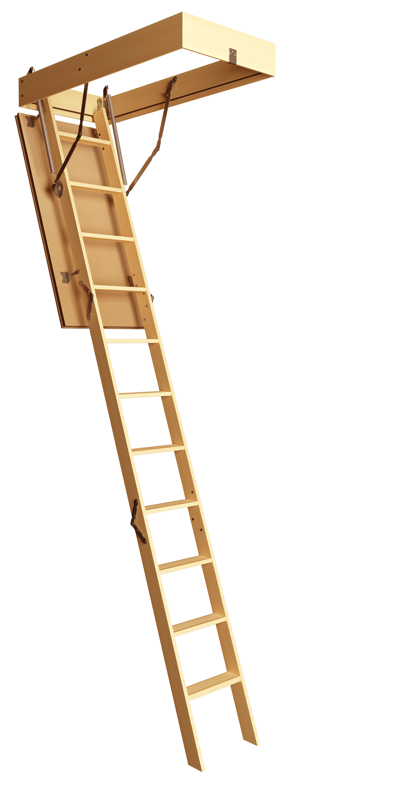 Складная конструкция, состоящая из 3 секций (сегментов). Материал деревянных элементов сосна, пропитанная специальным противогрибковым составом. В сложенном состоянии выглядит как блок, который храниться в потолке. Упрощённая система открывания, достаточно потянуть на шнурок и крышка распахнётся, фиксируется за счет мощных пружин.