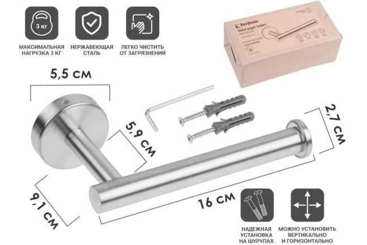 Держатель для бумаги выполнен из нержавеющей стали, обеспечивающий надежную защиту от влаги и долгий срок службы. Благодаря минималистичному дизайну превосходно вписывается в любой интерьер. Не требует дополнительного ухода, легко очистить от загрязнений. Держатель для туалетной бумаги возможно установить, как горизонтально, так и вертикально. Максимальная нагрузка на держатель: 3 кг.