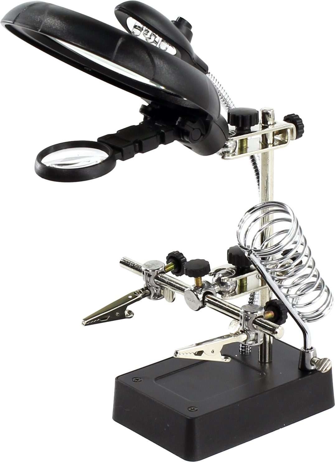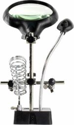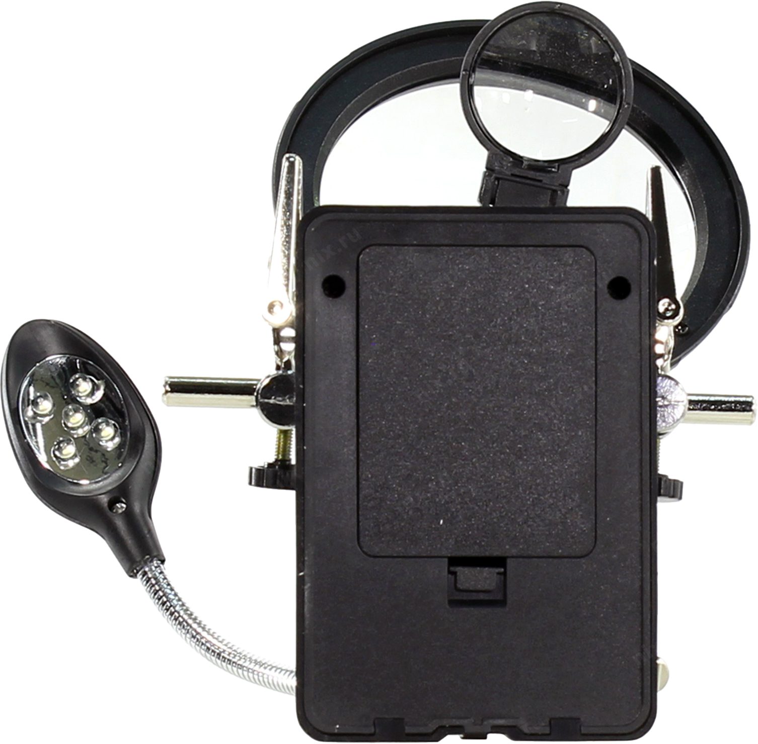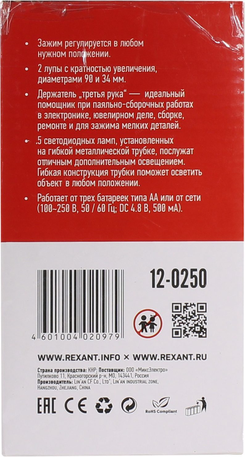 Держатель REXANT Третья рука (12-0250) служит главным образом при проведении паяльно-сборочных работ в электронике, ювелирном деле, сборке и ремонте для зажима мелких деталей в любом нужном положении, когда не хватает двух рук. Инструмент состоит из основания (подставка), шарнирного соединения с зажимами типа “крокодил” (подвижных во всех плоскостях, с никелевым покрытием), двух луп с кратностью увеличения 2.5 (диаметр 90 мм) и 7.5 (диаметр 34 мм), а также модуля подсветки. В данной модели реализована подсветка от двух альтернативных источников: батарей (не поставляются в комплекте) и блока питания (в комплекте). С помощью лупы можно рассмотреть даже самые мелкие детали.