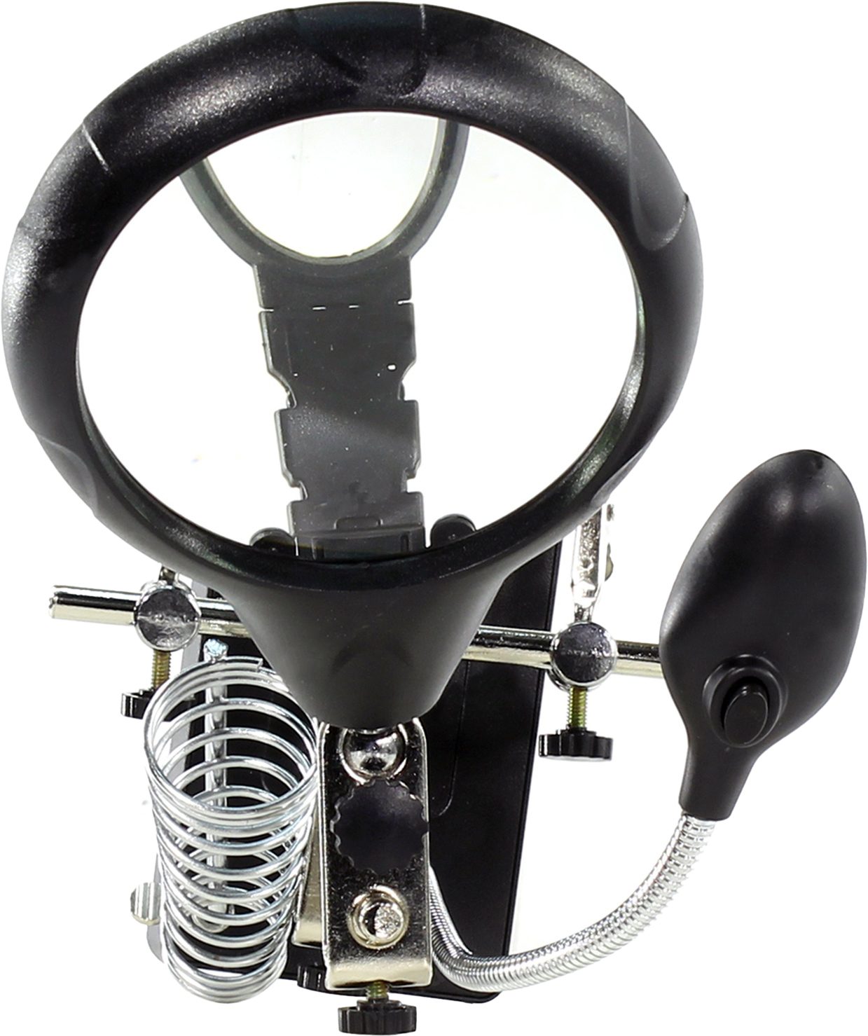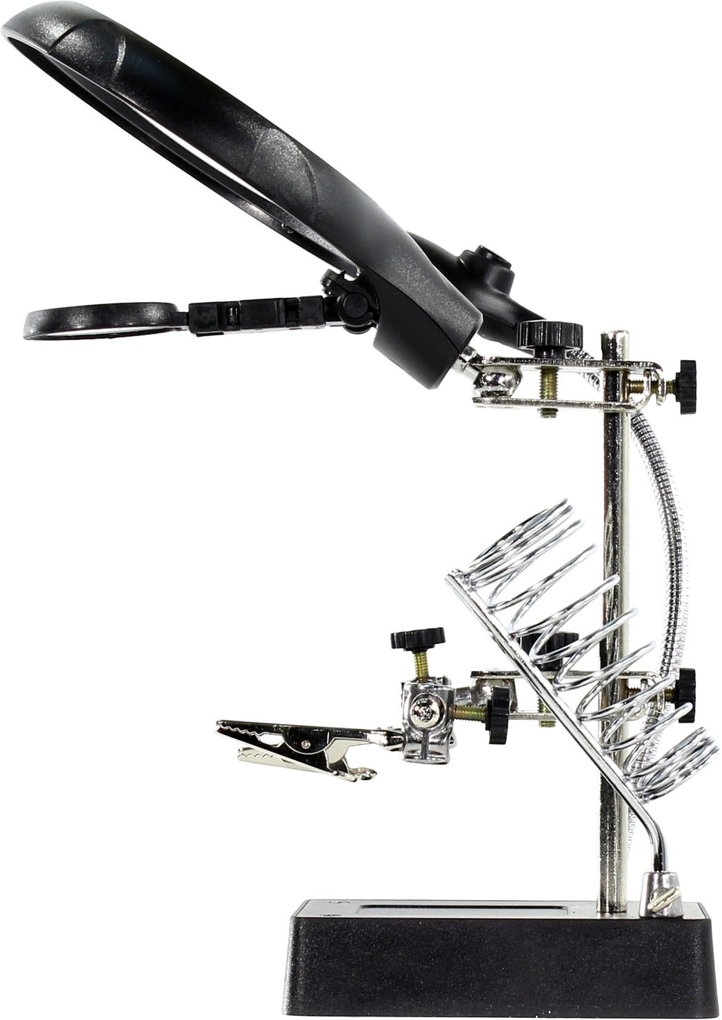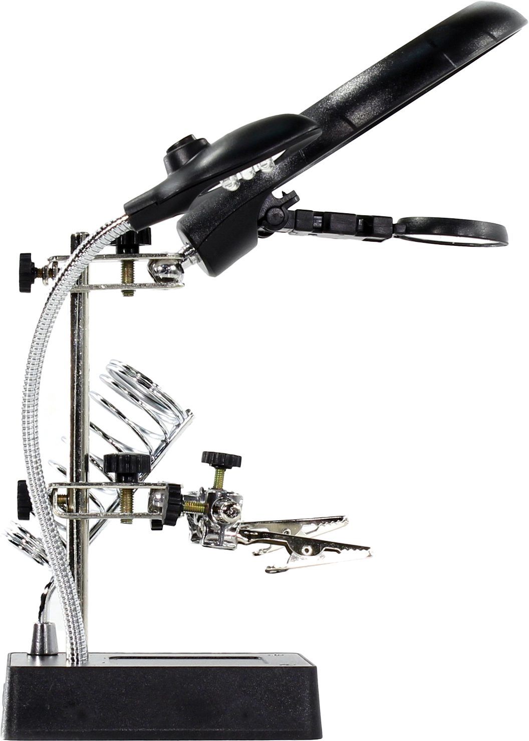 Держатель REXANT Третья рука (12-0250) служит главным образом при проведении паяльно-сборочных работ в электронике, ювелирном деле, сборке и ремонте для зажима мелких деталей в любом нужном положении, когда не хватает двух рук. Инструмент состоит из основания (подставка), шарнирного соединения с зажимами типа “крокодил” (подвижных во всех плоскостях, с никелевым покрытием), двух луп с кратностью увеличения 2.5 (диаметр 90 мм) и 7.5 (диаметр 34 мм), а также модуля подсветки. В данной модели реализована подсветка от двух альтернативных источников: батарей (не поставляются в комплекте) и блока питания (в комплекте). С помощью лупы можно рассмотреть даже самые мелкие детали.