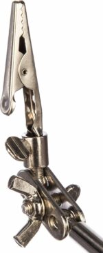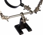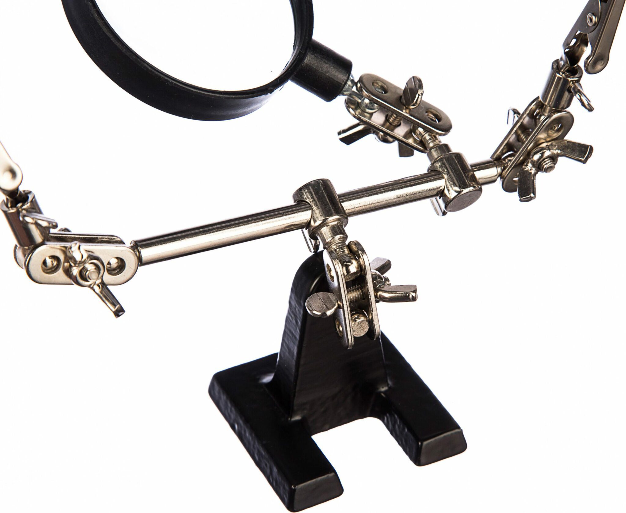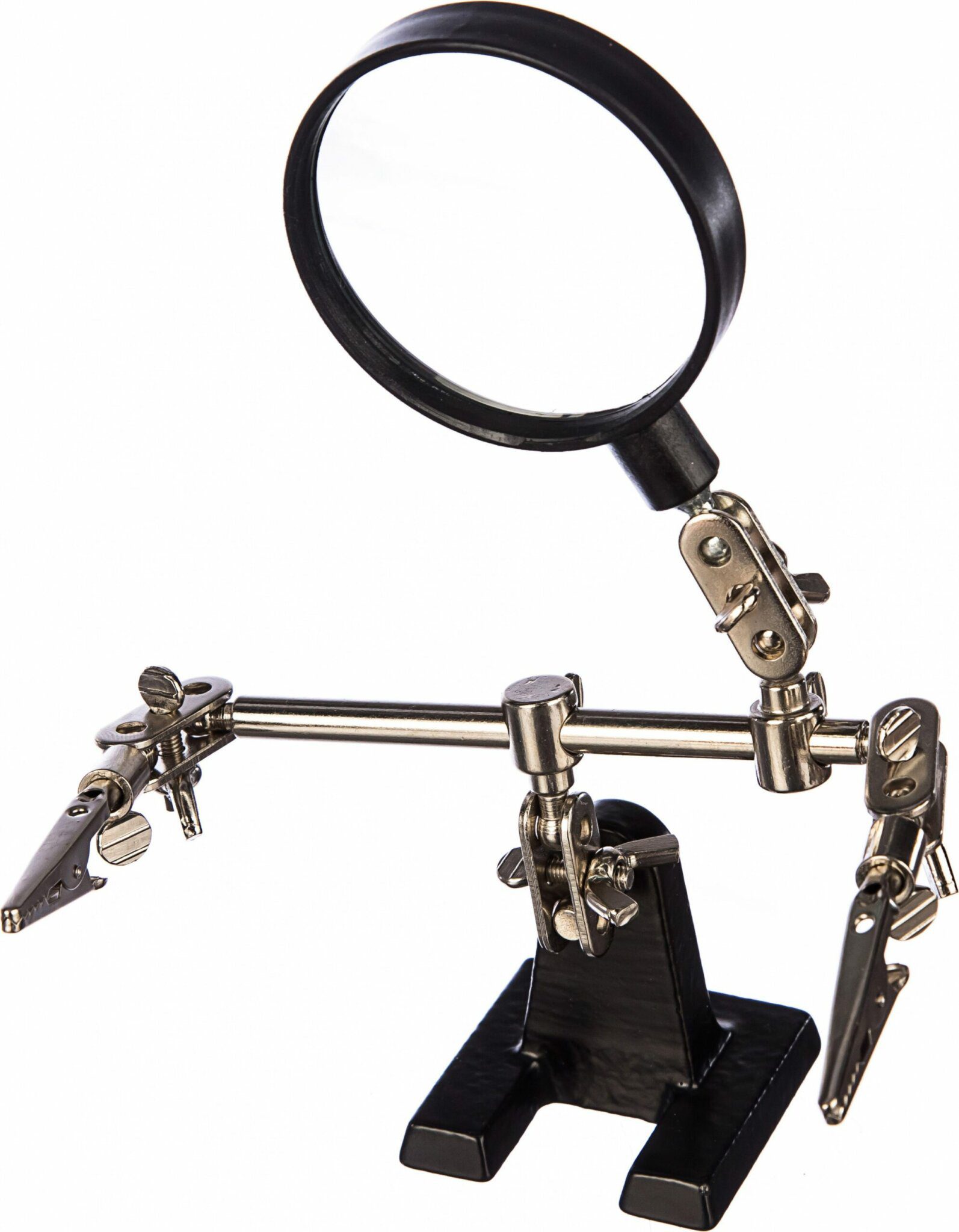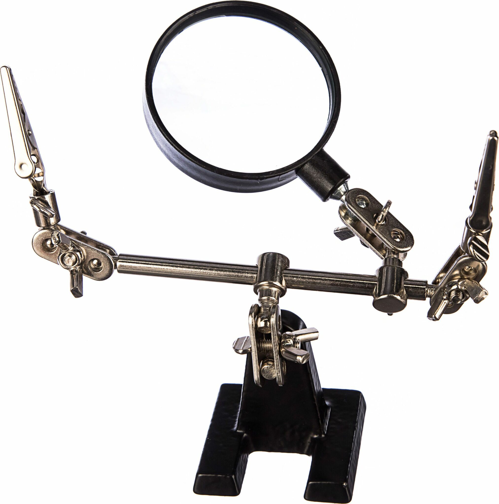 Держатель REXANT Третья рука (12-0251-4) служит, главным образом, при проведении паяльно-сборочных работ в электронике, ювелирном деле, сборке и ремонте для зажима мелких деталей в любом нужном положении, когда не хватает двух рук. Инструмент состоит из чугунного основания (тяжелая подставка), шарнирного соединения с зажимами типа “крокодил” (подвижных во всех плоскостях) с никелевым покрытием и лупы с 2.5 кратным увеличением (возможность регулировки положения, диаметр линзы 60 мм). С помощью лупы можно рассмотреть даже самые мелкие детали.