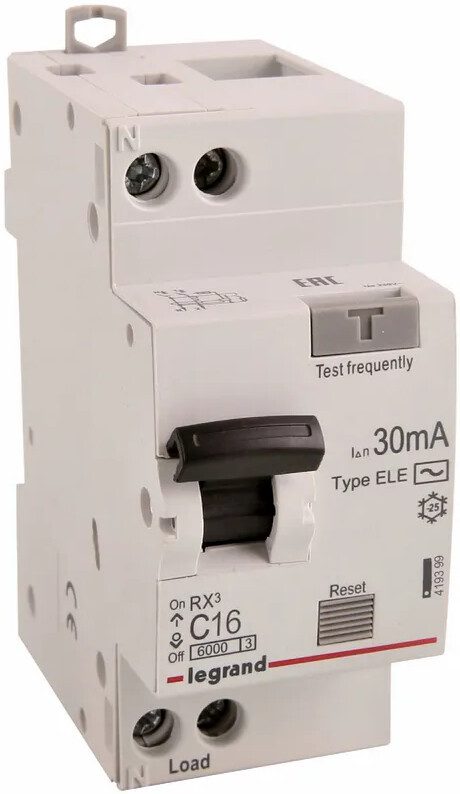 Дифавтомат LEGRAND RX3 6000 1P+N C 16 30мА 6кА AC (419399) применяется в электросетях для предотвращения поражения человека электрическим током и предотвращения порчи электроприборов при скачках напряжения и КЗ: при появлении утечки тока (пробои проводки или касание к оголенному проводу) или в случае замыкания сети прибор рассоединяет электроцепь.