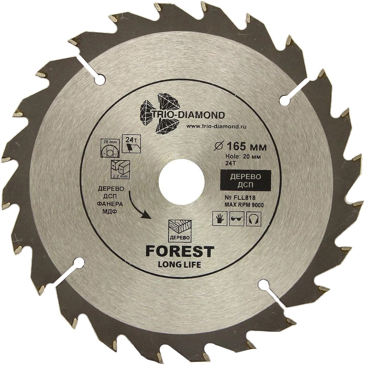 Диск пильный 165х20 мм 24 зуба TRIO-DIAMOND Forest Long Life (FLL818) предназначен для распила древесины, ДСП, фанеры. Угол заточки 15 градусов. Максимальное число оборотов 9200 RPM.