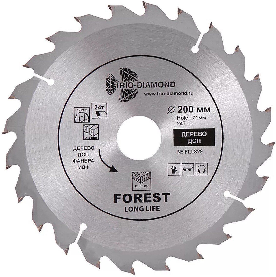 Диск пильный 200х32/30 мм 24 зуба TRIO-DIAMOND Forest Long Life (FLL829) предназначен для распила дерева, ДСП, фанеры. Максимальное число оборотов 7600 RPM. Угол заточки 15 градусов. Быстрый рез.