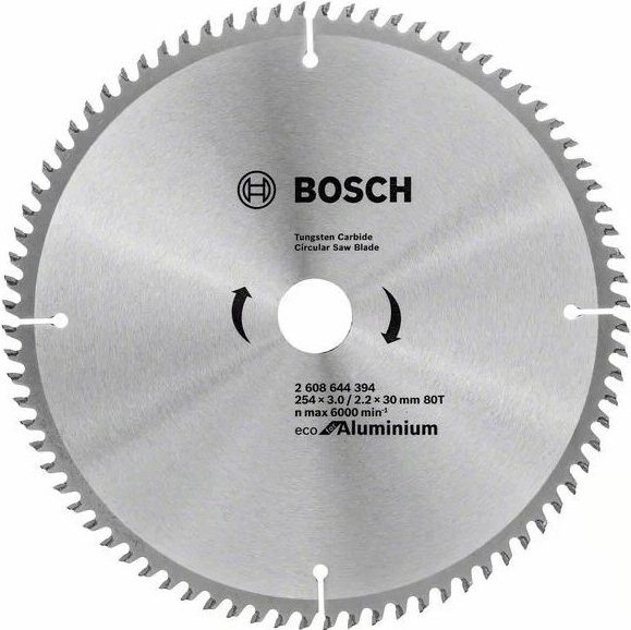 Диск пильный 254х30 мм 80 зубьев BOSCH Eco for Aluminium (2608644394) для резки алюминиевых профилей (например, для монтажа оконных рам), цветных металлов и пластика. Это диск, который делает быстрые и ровные резы. Технические особенности: тщательно подобранная геометрия и точная заточка зубьев обеспечивают надежность и производительность.