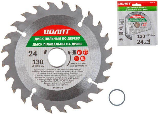 Диск пильный 130х20/16 мм 24 зуба ВОЛАТ по дереву (88110-24) предназначен для продольного и поперечного распила древесины. Корпус диска шлифованный, изготовлен из стали 65Г и термонормализован. Форма зуба (ATB) с положительным углом наклона. Посадка 20/16 мм с переходным кольцом в комплекте.