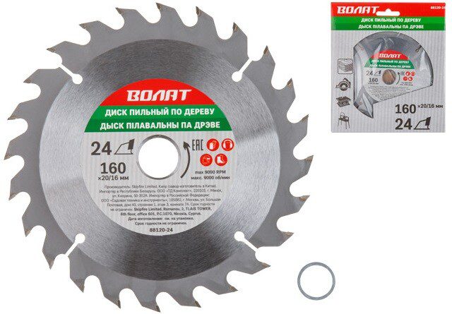 Диск пильный 160х20/16 мм 24 зуба ВОЛАТ по дереву (88120-24) предназначен для продольного и поперечного распила древесины. Корпус диска шлифованный, изготовлен из стали 65Г и термонормализован. Форма зуба (ATB) с положительным углом наклона. Посадка 20/16 мм с переходным кольцом в комплекте.