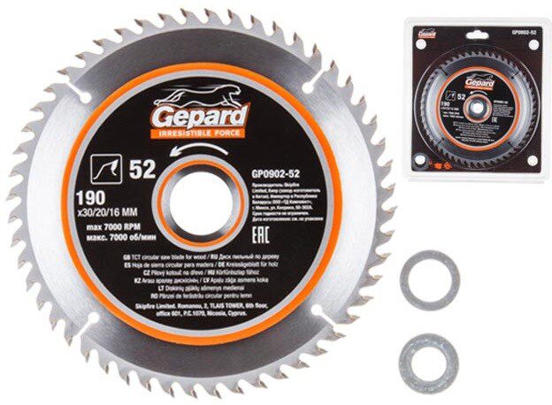 Диск пильный 190х30/20/16 мм 52 зуба GEPARD (GP0902-52) для распиловки заготовок из мягких и твердых пород древесины, фанеры, ДСП. Изготовлен пильный диск из пружинной стали марки 65MN. Форма зуба (ATB) с положительным углом наклона обеспечивает эффективную распиловку крупных заготовок. Твердосплавные напайки из сплава карбид вольфрама (YG6X) припаяны высокопрочным припоем. Алмазная заточка с выхаживанием значительно увеличивает срок службы инструмента. Тщательно подобранный угол заточки твердосплавных зубьев позволяет производить качественные и высокопроизводительные работы по распиловке древесины. Компенсационные прорези уменьшают колебания, подавляют шумы и препятствуют изгибанию диска при нагреве.