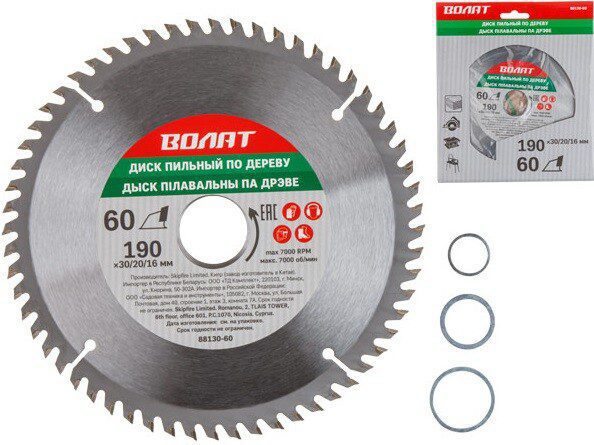 Диск пильный 190х30/20/16 мм 60 зубьев ВОЛАТ по дереву (88130-60) предназначен для продольного и поперечного распила древесины. Корпус диска шлифованный, изготовлен из стали 65Г и термонормализован. Форма зуба (ATB) с положительным углом наклона. Посадка 30/20/16 мм с переходным кольцом в комплекте.