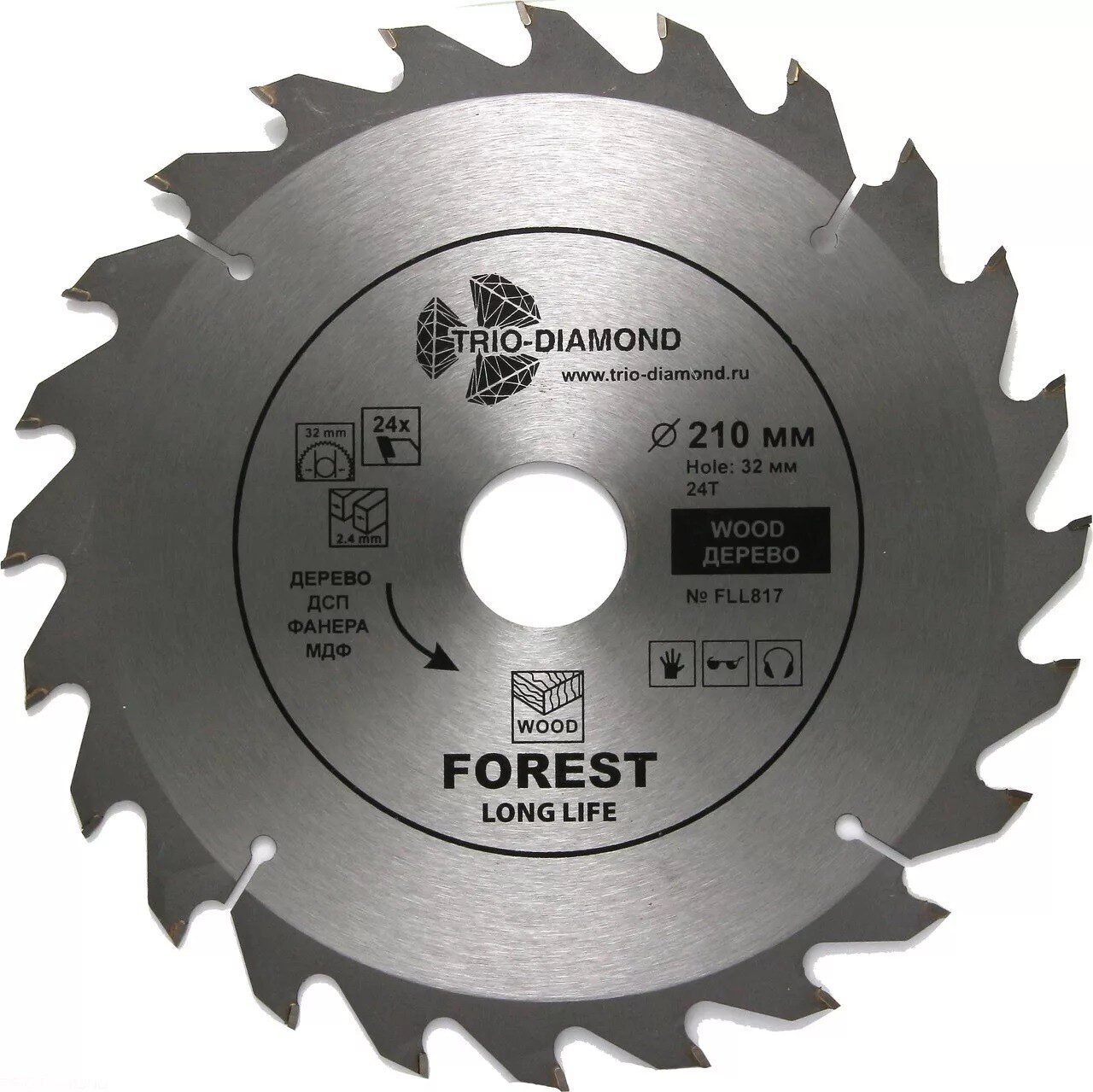 Диск пильный 210х32/30 мм 24 зуба TRIO-DIAMOND Forest Long Life (FLL817) предназначен для распила древесины, ДСП, фанеры. Угол заточки 15 градусов. Максимальное число оборотов 7200 RPM.