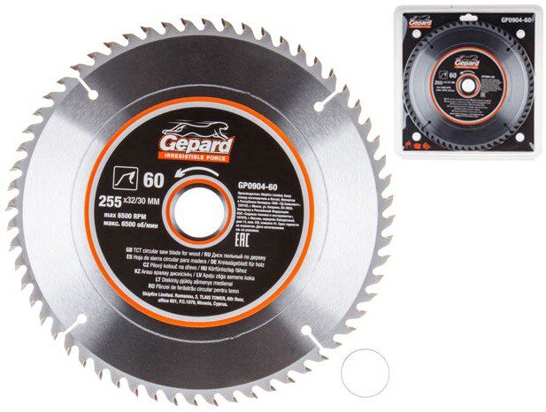Диск пильный 255х32/30 мм 60 зубьев GEPARD (GP0904-60) для распиловки заготовок из мягких и твердых пород древесины, фанеры, ДСП. Изготовлен пильный диск из пружинной стали марки 65MN. Форма зуба (ATB) с положительным углом наклона обеспечивает эффективную распиловку крупных заготовок. Твердосплавные напайки из сплава карбид вольфрама (YG6X) припаяны высокопрочным припоем. Алмазная заточка с выхаживанием значительно увеличивает срок службы инструмента. Тщательно подобранный угол заточки твердосплавных зубьев позволяет производить качественные и высокопроизводительные работы по распиловке древесины. Компенсационные прорези уменьшают колебания, подавляют шумы и препятствуют изгибанию диска при нагреве. Посадка 32/30 мм с переходным кольцом в комплекте.