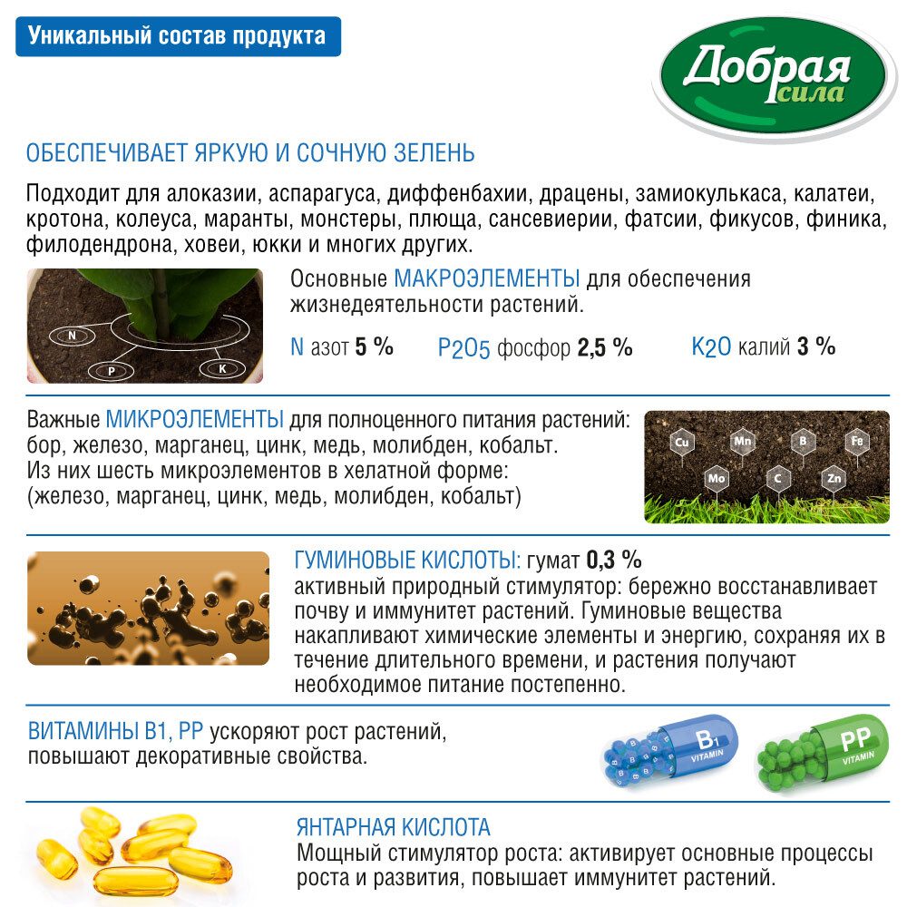 Удобрение органо-минеральное ДОБРАЯ СИЛА Для декоративно-лиственных 250 мл (DS21010121) содержит полный комплекс веществ, необходимых для полноценного и сбалансированного питания растений.