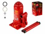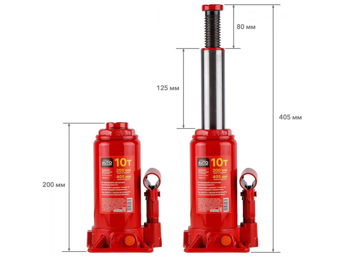 Домкрат гидравлический бутылочный 10 т STARTUL Auto (ST8018-10) – гидравлический бутылочный домкрат представляет собой устройство с ручным приводом, предназначенное для поднятия и фиксации грузов. Домкраты данного типа могут использоваться в качестве рабочего элемента в более сложных устройствах, таких как прессы, трубогибы, подъемники. Домкраты оснащены специальным предохранительным клапаном, обеспечивающим защиту от перегрузки, и не позволяющим поднятия веса более допустимого. Основание – чугун. Корпус – сталь.