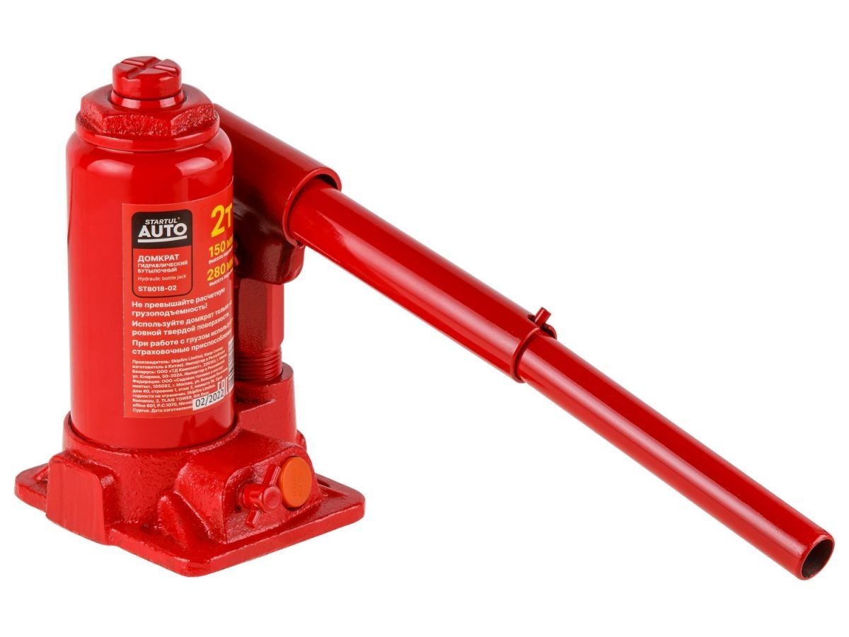 Домкрат гидравлический бутылочный 2 т STARTUL Auto (ST8018-02) – гидравлический бутылочный домкрат представляет собой устройство с ручным приводом, предназначенное для поднятия и фиксации грузов. Домкраты данного типа могут использоваться в качестве рабочего элемента в более сложных устройствах, таких как прессы, трубогибы, подъемники. Домкраты оснащены специальным предохранительным клапаном, обеспечивающим защиту от перегрузки, и не позволяющим поднятия веса более допустимого. Основание – чугун. Корпус – сталь.