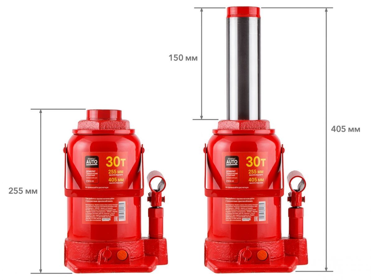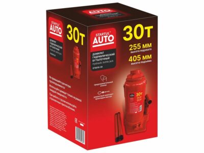 Домкрат гидравлический бутылочный 30 т STARTUL Auto (ST8018-30) – гидравлический бутылочный домкрат представляет собой устройство с ручным приводом, предназначенное для поднятия и фиксации грузов. Домкраты данного типа могут использоваться в качестве рабочего элемента в более сложных устройствах, таких как прессы, трубогибы, подъемники. Домкраты оснащены специальным предохранительным клапаном, обеспечивающим защиту от перегрузки, и не позволяющим поднятия веса более допустимого. Основание – чугун. Корпус – сталь.