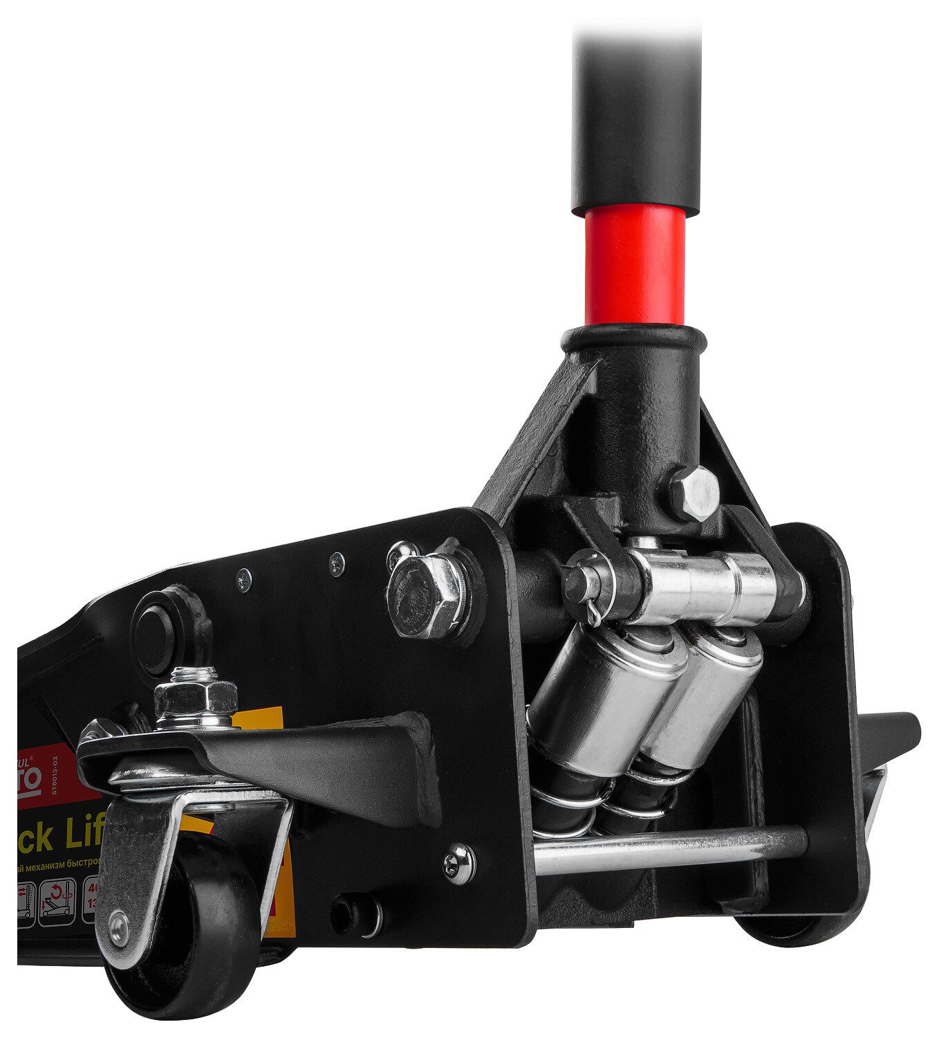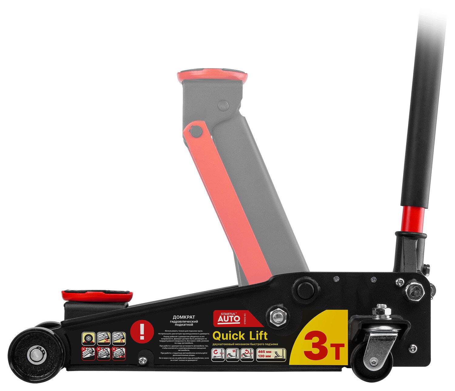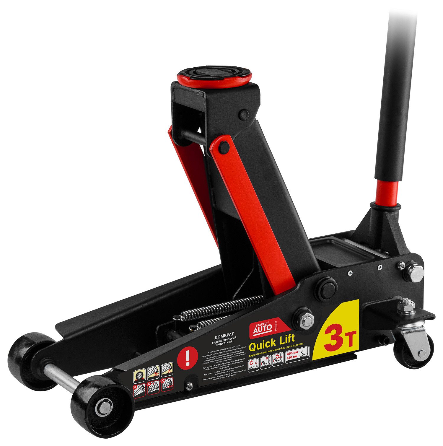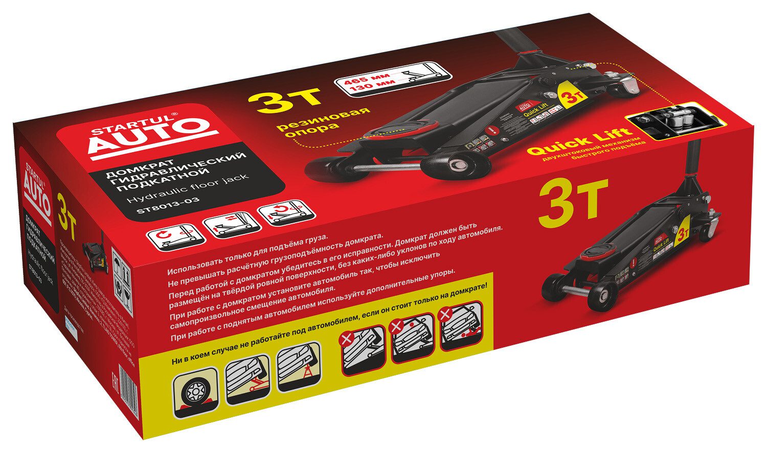 Домкрат гидравлический подкатной с быстрым подъемом 3 т STARTUL Auto (ST8013-03) – профессиональный домкрат гидравлический подкатной с ручным приводом, предназначенный для поднятия грузов на высоту. Отличается простотой обслуживания и надежностью в эксплуатации, позволяет при небольшом рабочем усилии осуществлять плавный подъем груза и его точную фиксацию на заданной высоте. Модель оснащена двухштоковым механизмом быстрого подъема (QUICK LIFT) для поднятия опорной площадки на максимальную высоту за 7 полных качков рукоятью. Подходит для использования на станциях техобслуживания и шиномонтажа. Резиновая опора (для защиты груза и самого домкрата от механических повреждений), предохранительный клапан (для защиты от перегрузки), лоток для болтов и гаек, прорезиненная рукоять.