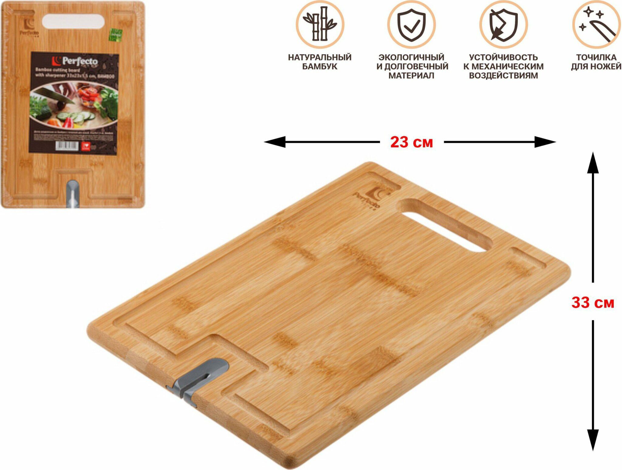 Доска разделочная с точилкой для ножей PERFECTO LINEA Bamboo 33х23х1,5 см (35-332315) из бамбука отличается высокой прочностью и износоустойчивостью, устойчивостью к механическим воздействиям и окрашиванию. Отличительная особенность этой доски – наличие точилки для ножей.