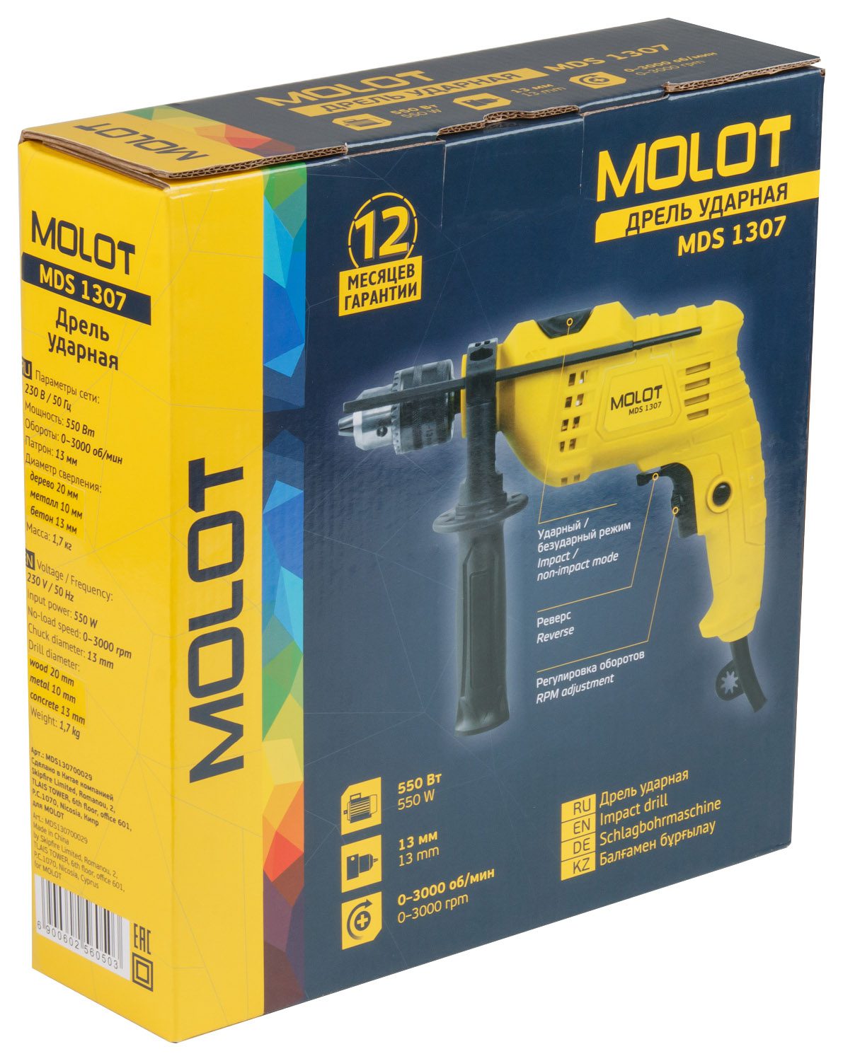Дрель ударная MOLOT MDS 1307 (MDS130700029) компактная дрель в своем классе, дополнительная рукоятка обеспечивает надежный захват, надежный металлический сверлильный патрон, дополнительно имеется регулировка скорости, ограничитель глубины, реверс и блокировка кнопки включения.