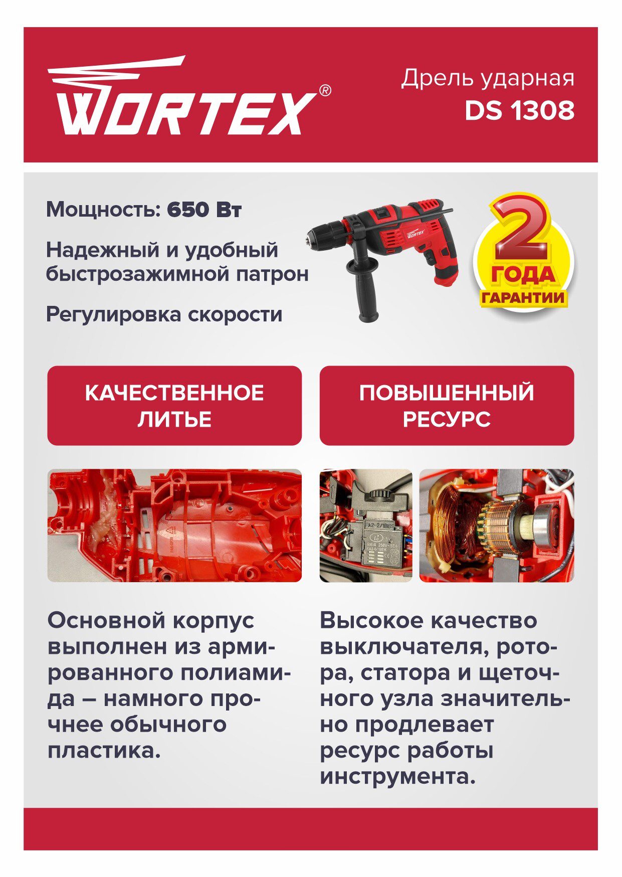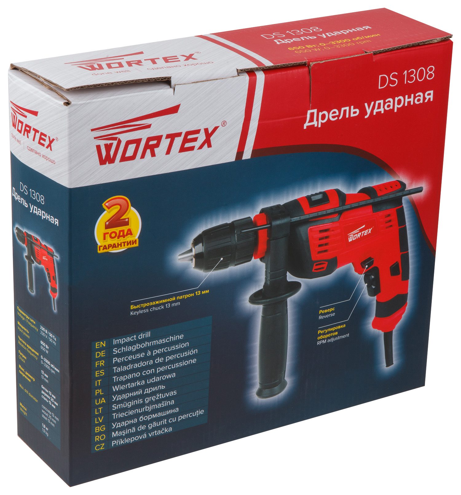 Дрель ударная WORTEX DS 1308 (DS130800029) имеет медную обмотку двигателя, надежный металлический сверлильный патрон, дополнительная рукоятка обеспечивает надежный захват, имеется регулировка скорости, ограничитель глубины, реверс и блокировка кнопки включения.