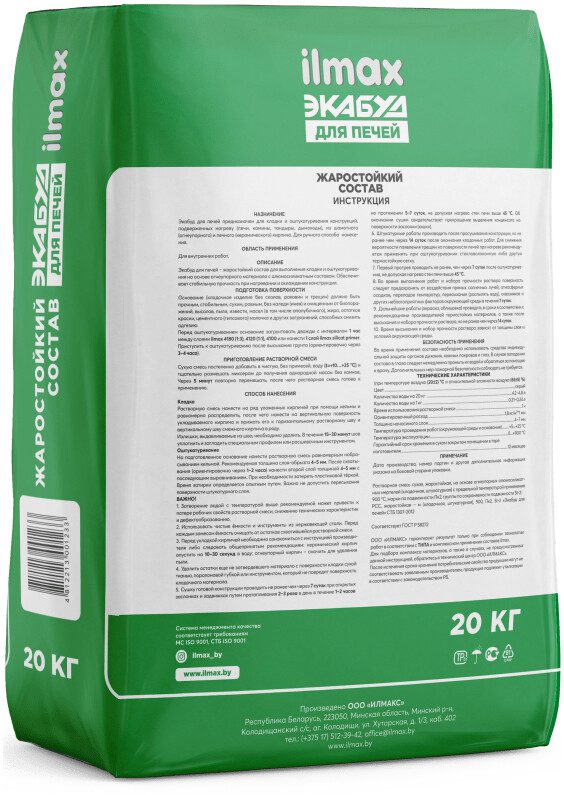 Смесь кладочная ILMAX Экабуд для печей 20 кг предназначена для кладки и оштукатуривания печей, каминов, дымоходов из керамического (красного) кирпича и других огнеупорных материалов (шамотный кирпич и др.).Для кладки применяются все виды огнеупорного кирпича (глиняный, шамотный и др.) без сколов и трещин. Штучные стеновые материалы должны быть очищены от пыли, крошки и других загрязнений, способных ослабить сцепление раствора с основанием. Основание перед укладкой первого ряда блоков необходимо очистить от грязи, пыли, наледи и др.