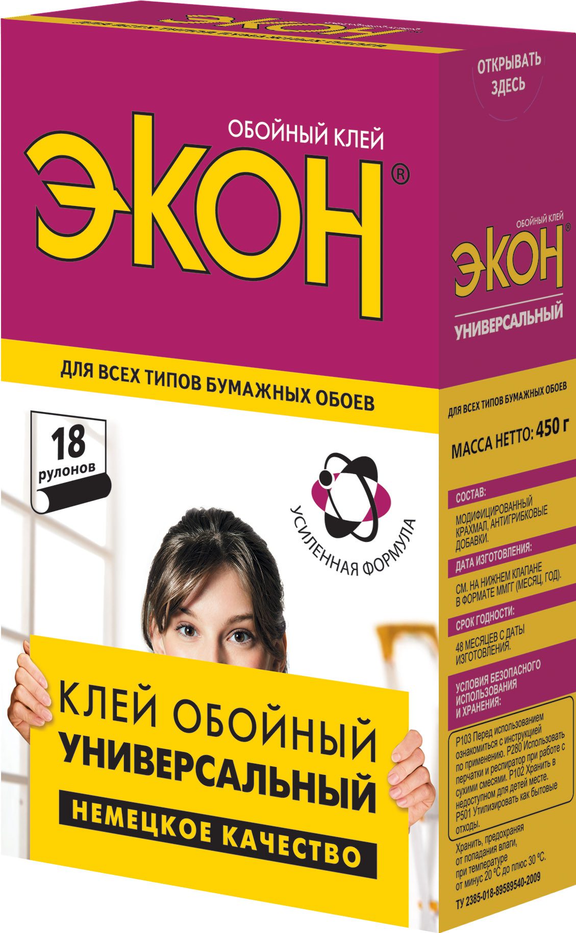 Клей обойный ЭКОН Универсальный 450 г (1830002) предназначен для наклеивания всех видов бумажных обоев: гладких, структурных, гофрированных, дуплекс, тяжелых. С защитой от плесени.