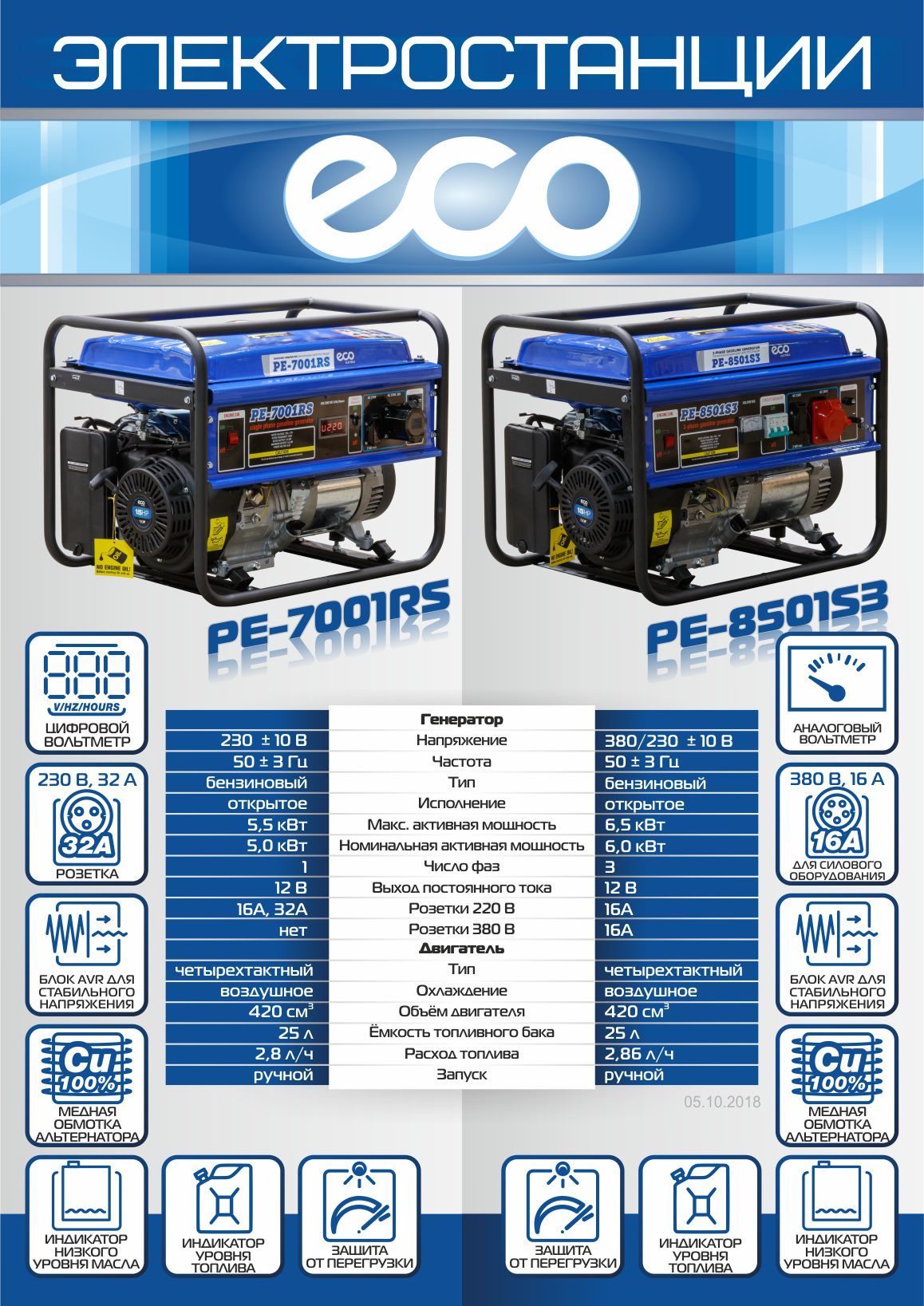Генератор бензиновый ECO PE-8501S3 предназначена для обеспечения электричеством частных домов, гаражей, строительных площадок, производственных участков с мощностью потребителей до 6 кВт. Способна производить переменный ток напряжением 230 и 380 Вольт, а также постоянный ток напряжением 12 Вольт. Медная обмотка генератора обеспечивает его надежность и не допускает перегрев. Наличие блока AVR гарантирует стабильную подачу электропитания на подключенные электроприборы или в запитанную от станции электросеть.