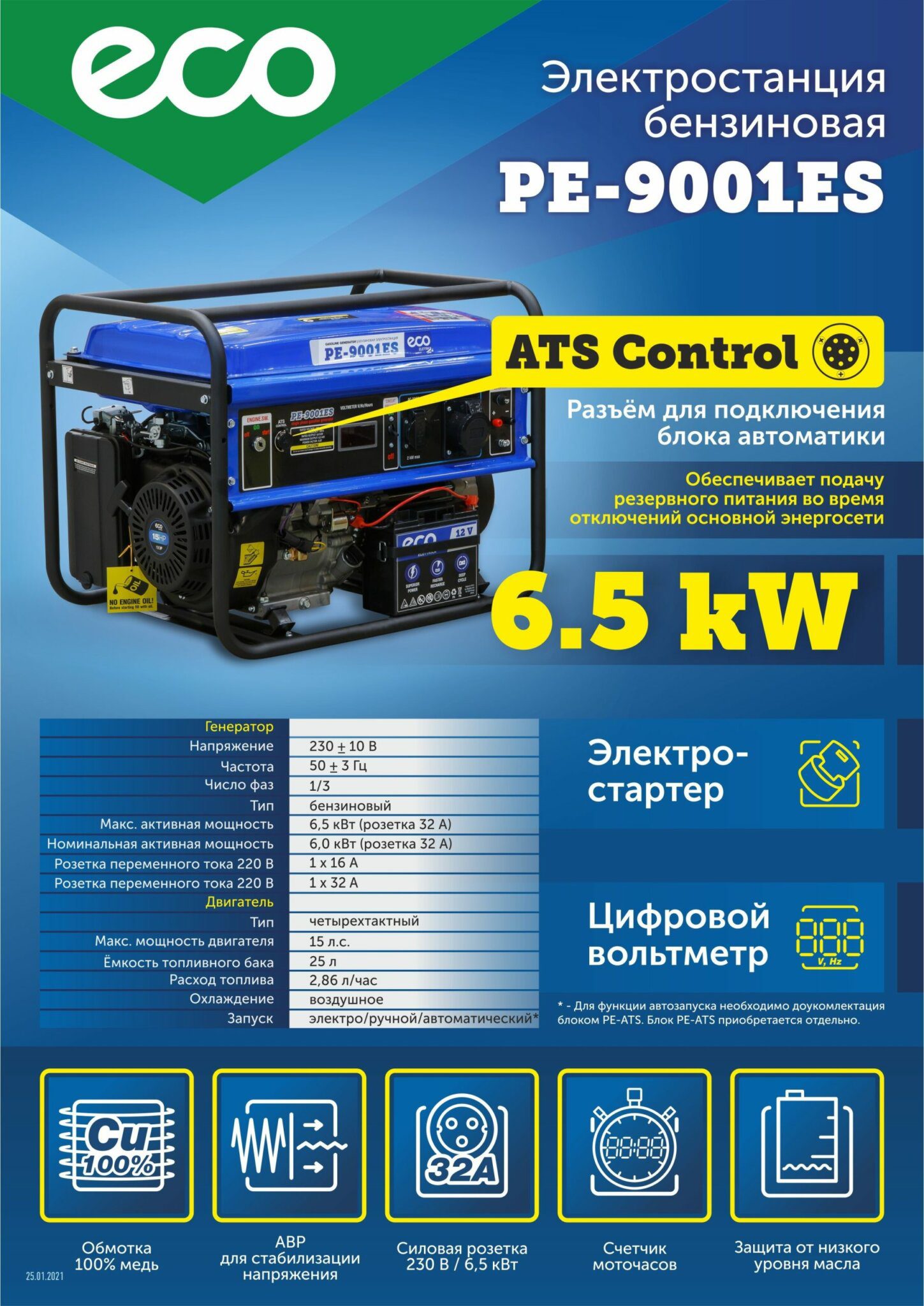 Генератор бензиновый ECO PE-9001ES с максимальной мощностью 6,5 кВт для напряжения 220 В. Разъём для подключения блока автоматики (автозапуск АВР). Электрозапуск и АКБ в комплекте. Медная обмотка альтернатора. Силовая розетка на 6,5 кВт. Стандартная розетка на 2,1 кВт. Максимальная мощность двигателя – 15 л.с. Блок AVR для стабильного напряжения. Защита от низкого уровня масла. Защита от перегрузки. Индикатор уровня топлива. Цифровой индикатор 3-в-1: вольтметр, частотометр, счетчик моточасов. Чугунная гильза, увеличивающая моторесурс двигателя. Жёсткая рама. Низкий уровень шума.