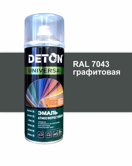 Алкидная эмаль DETON UNIVERSAL применяется для: металла, древесины, камня и тд. Цвета соответствуют европейскому стандарту RAL. Требует предварительной грунтовки поверхности. Атмосферостойкость краски защищает слой от атмосферных воздействий.