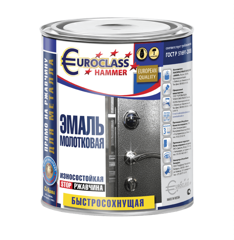 Эмаль алкидная EUROCLASS молотковая шоколадная 0,4 кг (53-374) придает поверхности декоративный эффект, имитирующий удары молотком чеканку. Эмаль декоративная с молотковым эффектом образует покрытие, устойчивое к воздействию атмосферных факторов: воды, УФ-излучения, резких перепадов температур, а также соленой воды и минерального масла. Скрывает мелкие неровности и дефекты окрашиваемой поверхности, обладает превосходной адгезией.