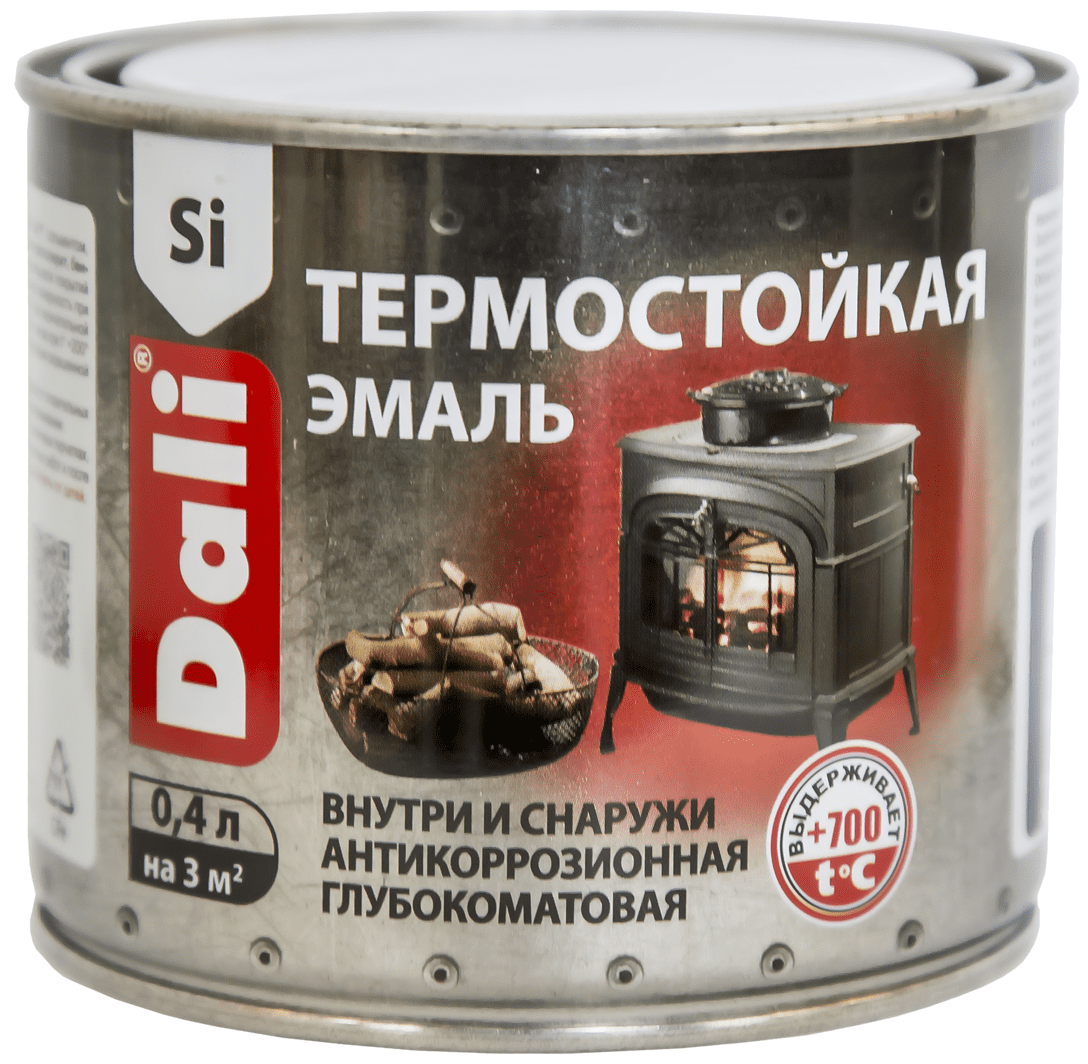 Эмаль кремнийорганическая DALI термостойкая серебро 0,4 л предназначена для защитно-декоративной обработки металлического оборудования и поверхностей, подвергающихся воздействию высоких температур. Внутри и снаружи помещений по стальным (в т. ч. нержавеющая сталь) и чугунным поверхностям (печи, дымоходы, выхлопные системы автомобилей, внешние стороны мангалов и пр.), подвергающимся нагреву до 600⁰С.