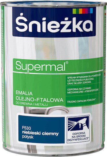 Эмаль масляно-фталевая SNIEZKA Supermal темно-синяя 0,8 л предназначена для декоративно-защитного окрашивания древесины, древопроизводных материалов, штукатурок, а также стальных и чугунных элементов, использующихся внутри и снаружи помещений, таких как: окна, двери, мебель, ограда и т.п. Рекомендуется для применения в строениях общественного предназначения, например, медицинских и образовательных учреждениях, а также в помещениях промышленной отрасли (без непосредственного контакта с пищей).