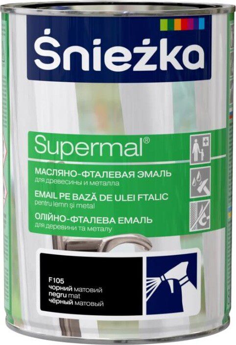 Эмаль масляно-фталевая SNIEZKA Supermal черная глянцевая 0,8 л предназначена для декоративно-защитного окрашивания древесины, древопроизводных материалов, штукатурок, а также стальных и чугунных элементов, использующихся внутри и снаружи помещений, таких как: окна, двери, мебель, ограда и т.п. Рекомендуется для применения в строениях общественного предназначения, например, медицинских и образовательных учреждениях, а также в помещениях промышленной отрасли (без непосредственного контакта с пищей).