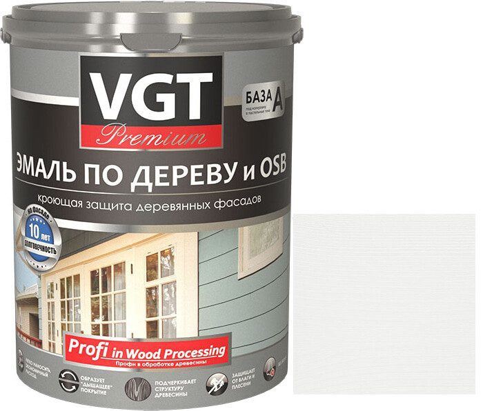 Эмаль акриловая VGT ВД-АК-1179 по дереву Профи супербелая база А 1 кг – высококачественная специализированная эмаль на основе акрилового связующего для окраски новых и ранее окрашенных деревянных фасадов, окон и плит OSB (ориентировано-стружечных плит). Содержание акриловой дисперсии обеспечивает прекрасную адгезию к дереву и поверхностям, ранее окрашенным алкидами, а также устойчивость к воздействию дезинфицирующих моющих средств. Обладает высокой стойкостью к потере глянца и выцветанию. Благодаря эластичной плёнке устойчива к растрескиванию. Подтвержденная долговечность покрытия на фасадах. Имеет хорошие грязеотталкивающие свойства. Подчёркивает структуру древесины. Образует “дышащее” покрытие, гидрофобную плёнку. А также защищает от влаги и плесени.