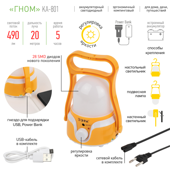 ЭРА КА-801 “Гном” – эргономичный кемпинговый LED-фонарь с удобной ручкой и диммированием яркости. Работает от встроенного аккумулятора, подзаряжается от USB-кабеля, поставляемого в комплекте. Качественное ровное освещение создают 28 светодиодов нового поколения. С помощью диммера на корпусе яркость света регулируется плавно, что очень комфортно для глаз. Круглый плафон формирует объемное заливающее освещение. Благодаря специальной поворотной ручке кемпинговый фонарь ЭРА “Гном” можно крепить разными способами и использовать как подвесную лампу, настенный светильник, настольный светильник. Выбор минимальной яркости дает возможность применять этот фонарь в качестве портативного ночника. При максимальной яркости световой поток равен 490 Лм. Одна полная подзарядка обеспечит вас 5 часами непрерывного свечения. Фонарь-светильник ЭРА КА-801 имеет приятный дизайн с плавными мягкими линиями и теплую цветовую гамму.