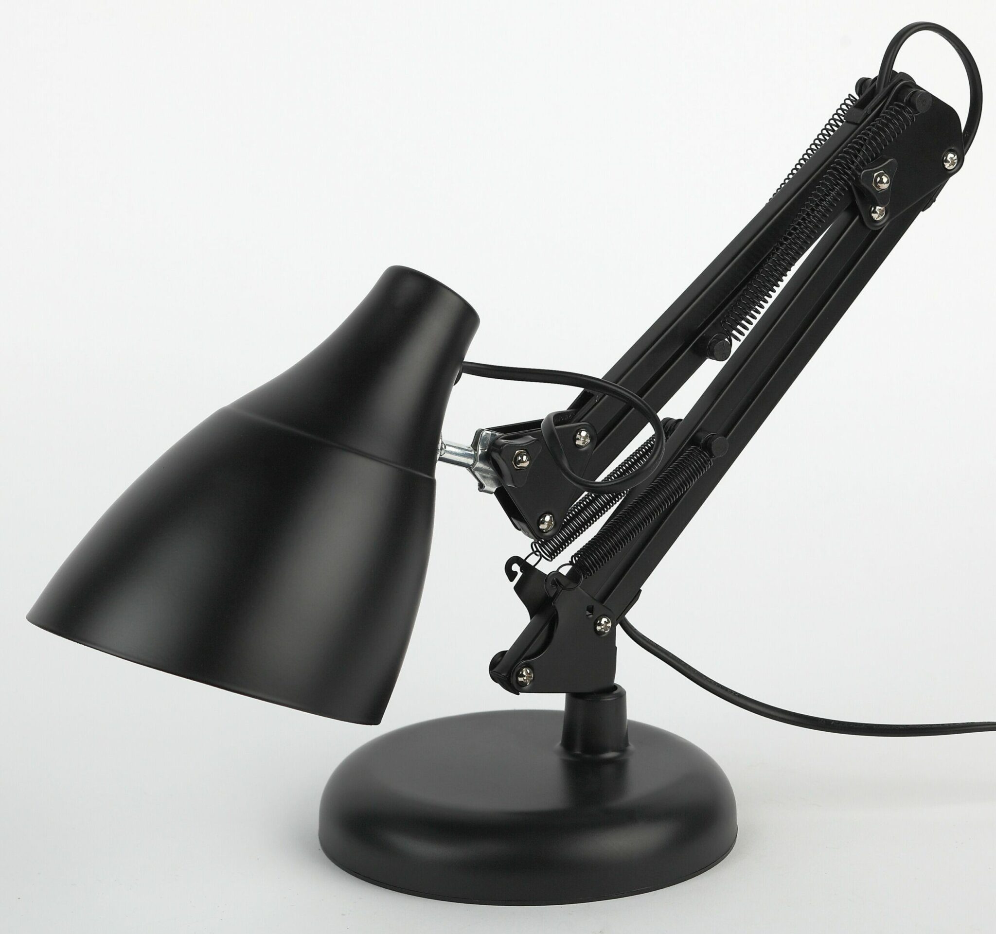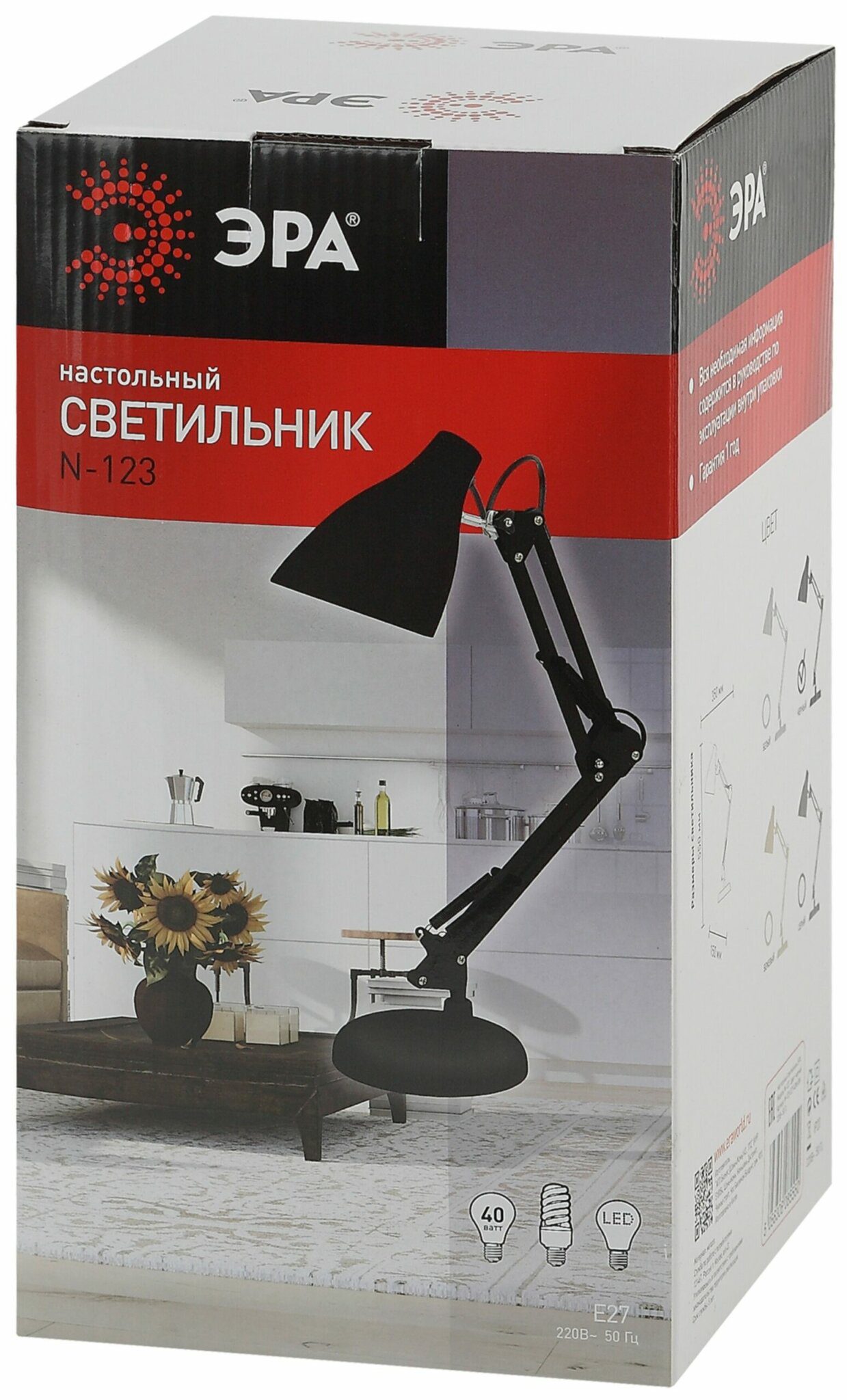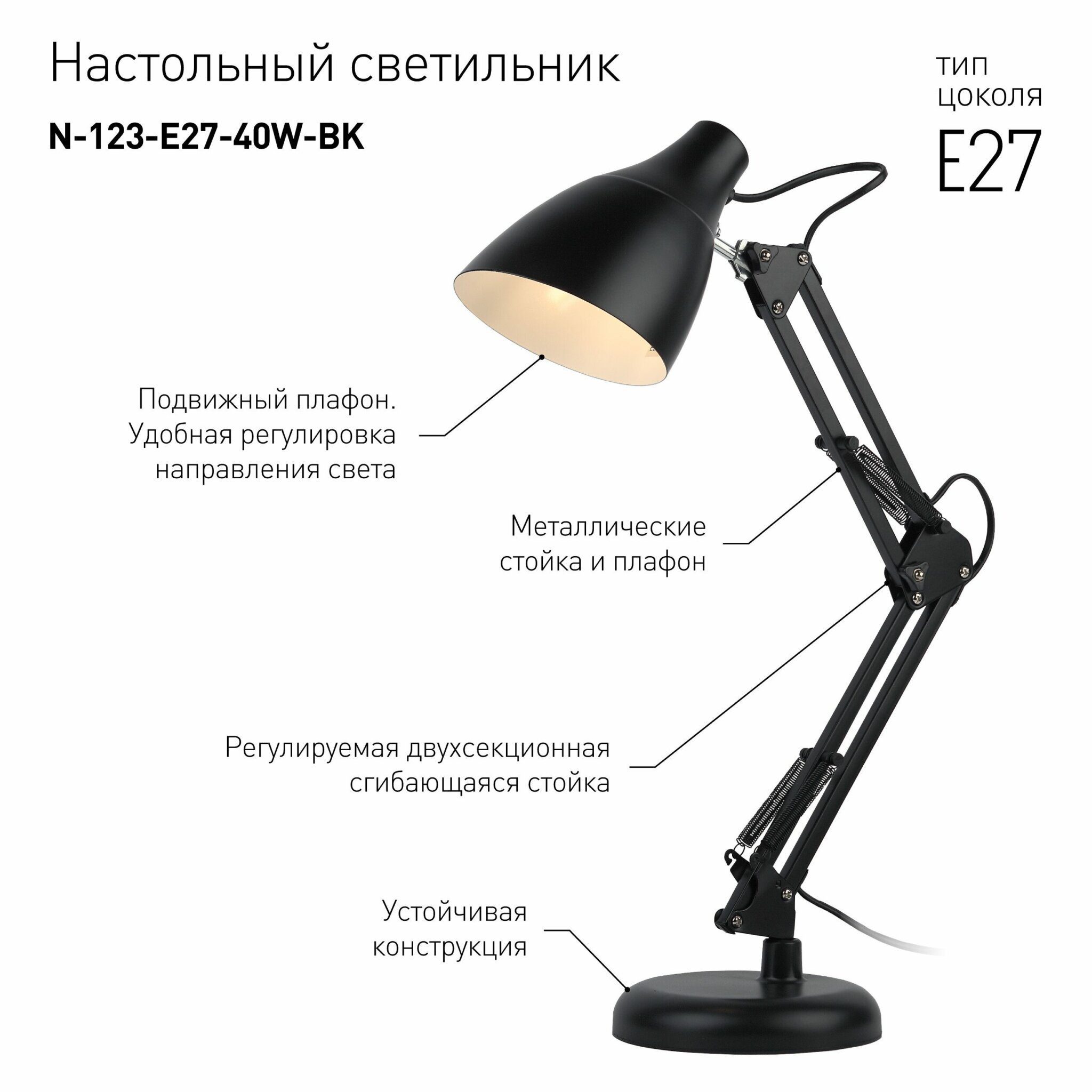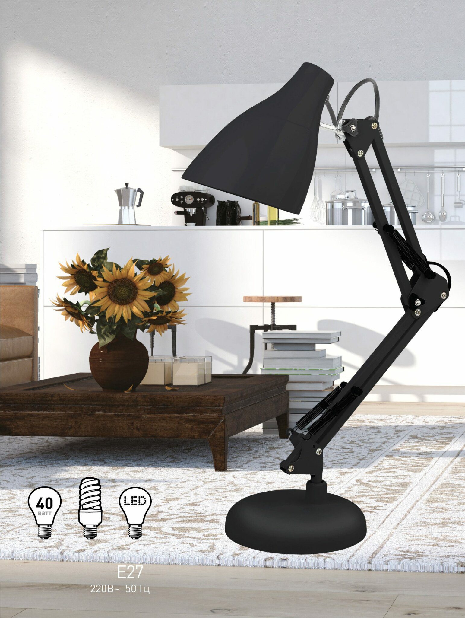 Лампа настольная ЭРА N-123-Е27-40W-BK черная (N-123-Е27-40W-BK чер) трендового дизайна с классической конструкцией может использоваться с разными источниками света – лампой накаливания, компактной люминесцентной лампой (КЛЛ) или светодиодной (LED) лампой. Выключатель на проводе. Устойчивое основание. Высота плафона регулируется двухсекционной сгибающейся стойкой, направление света – поворотом и наклоном плафона в любом направлении.