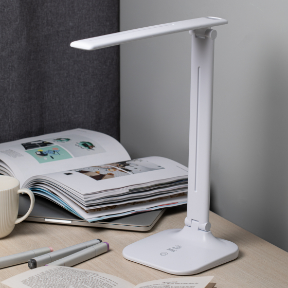 Настольный светильник со светодиодами (LED) в качестве источников света. Встроенный литиевый аккумулятор для автономной работы. Подзарядка от USB. USB-кабель в комплекте. Оснащен сенсорным управлением с возможностью выбора цветовой температуры (теплый, нейтральный или холодный свет). Плавный диммер для регулировки яркости. Складная конструкция для оптимального хранения.