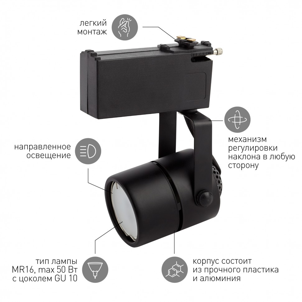 Трековый светильник TR11-GU10 BK под лампу универсального черного цвета незаменим при создании направленного освещения. Он имеет поворотную часть, благодаря чему возможно менять направление светового потока в любую сторону. Источником света выступает лампа с цоколем GU10, которая делает светильник максимально универсальным и дает возможность выбрать необходимую мощность, цветовую температуру и угол рассеивания. Направленный свет светильника создаст зонированное пространство в помещении офиса, магазина или конференц-зала. Направленный свет позволит выделить требуемую зону, привлечь к ней внимание. Трековый светильник легко монтируется, позволяя, при необходимости, полностью менять структуру пространства.