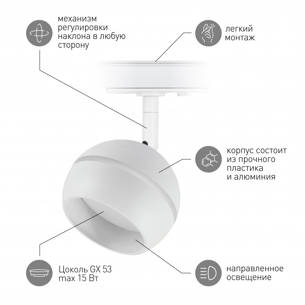 Однофазный трековый светильник под лампу с цоколем GX53 с плоским трековым адаптером. Корпус светильника выполнен из алюминия и пластика. Благодаря возможности использования лампы GX53 светильник можно сделать достаточно ярким, используя лампы 12-15W. Передняя часть плафона выполнена из опалового акрила, который, сужая угол рассеивания и снижая тем самым эффект ослепления, также выполняет декоративную функцию и делает светильник эстетически более привлекательным.