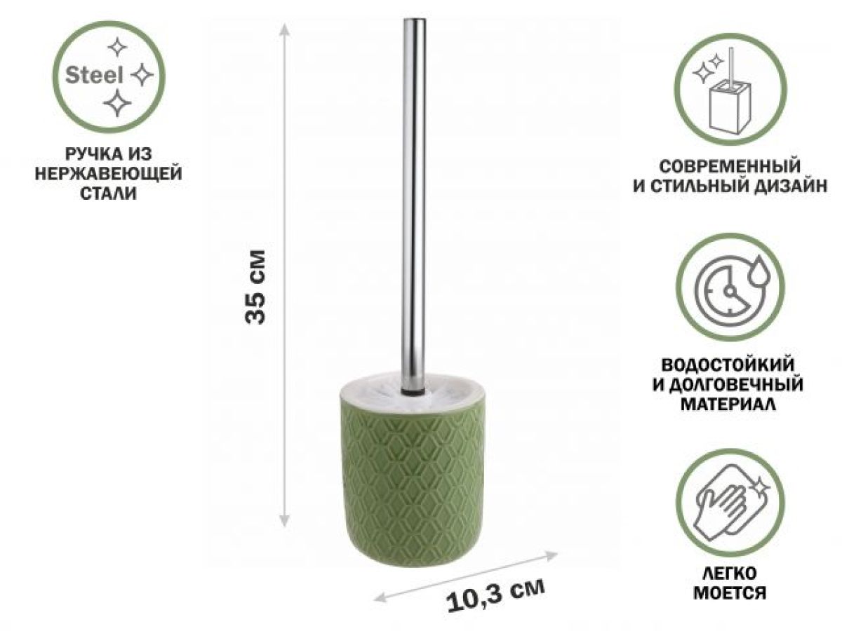 Ершик с подставкой PERFECTO LINEA Oasis зеленый (35-757004) является идеальным компаньоном для поддержания чистоты и гигиены. Ручка изготовлена из нержавеющей стали, что придает ей прочность, долговечность и устойчивость к коррозии. Стойка из керамики не только обеспечивает надежную поддержку ершика, но и добавляет стильный акцент в ванной комнате. Благодаря своей устойчивой конструкции, стойка предотвращает скольжение и падение ершика, обеспечивая безопасное использование.