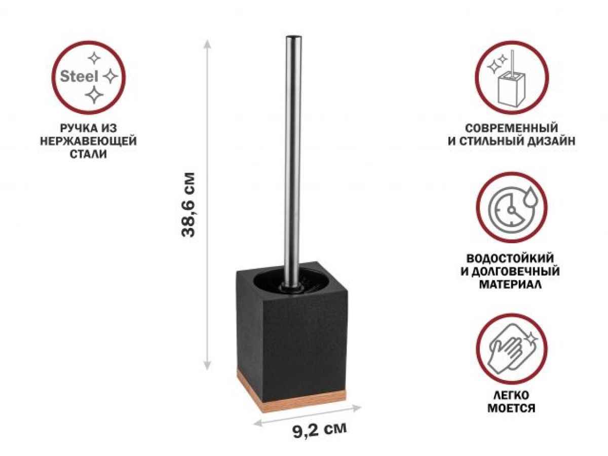 Ершик для унитаза PERFECTO LINEA Wood Bliss черный (35-720104) имеет необычный дизайн, созданный с помощью композитного материала: полирезина под натуральный камень. Благодаря такой структуре изделие имеет низкую теплопроводность, приятное на ощупь, а также устойчиво к влаге и повышенным температурам.