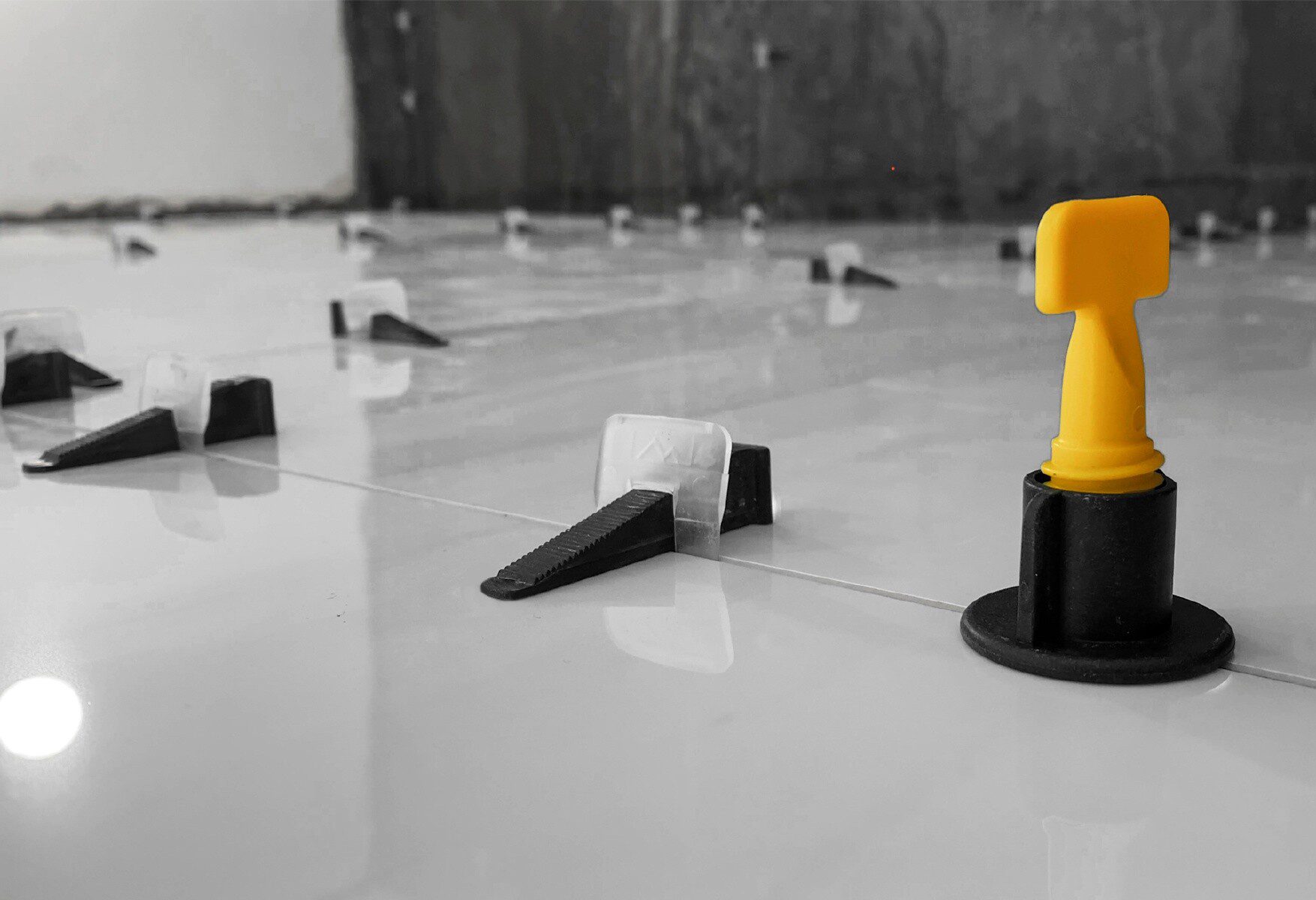 1. Вставьте фиксатор между двумя плитками таким образом, чтобы его ножка была параллельна плиткам в зазоре.
