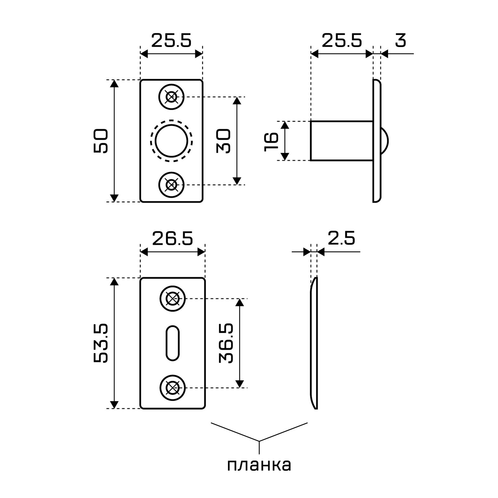 Фиксатор дверной с шариком. Предназначен для запирания межкомнатных дверей (алюминиевых, деревянных, из МДФ и ПВХ). Защелка не запирает, а защелкивает полотно, тем самым удерживая его в дверном проеме. Материал – ЦАМ, гальваническое покрытие. Габариты торцевой планки – 47х25 мм. В комплекте шурупы и ответная планка.