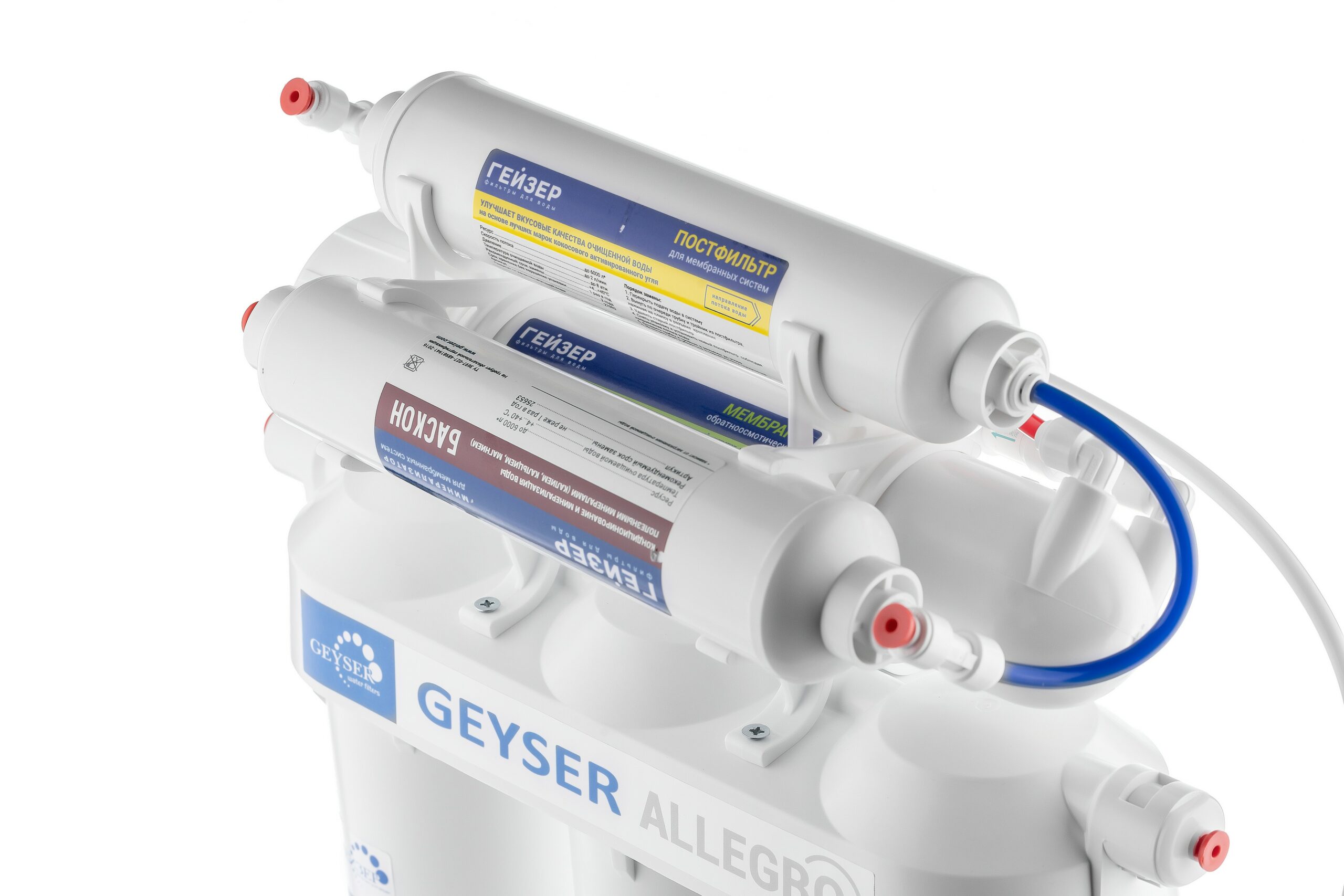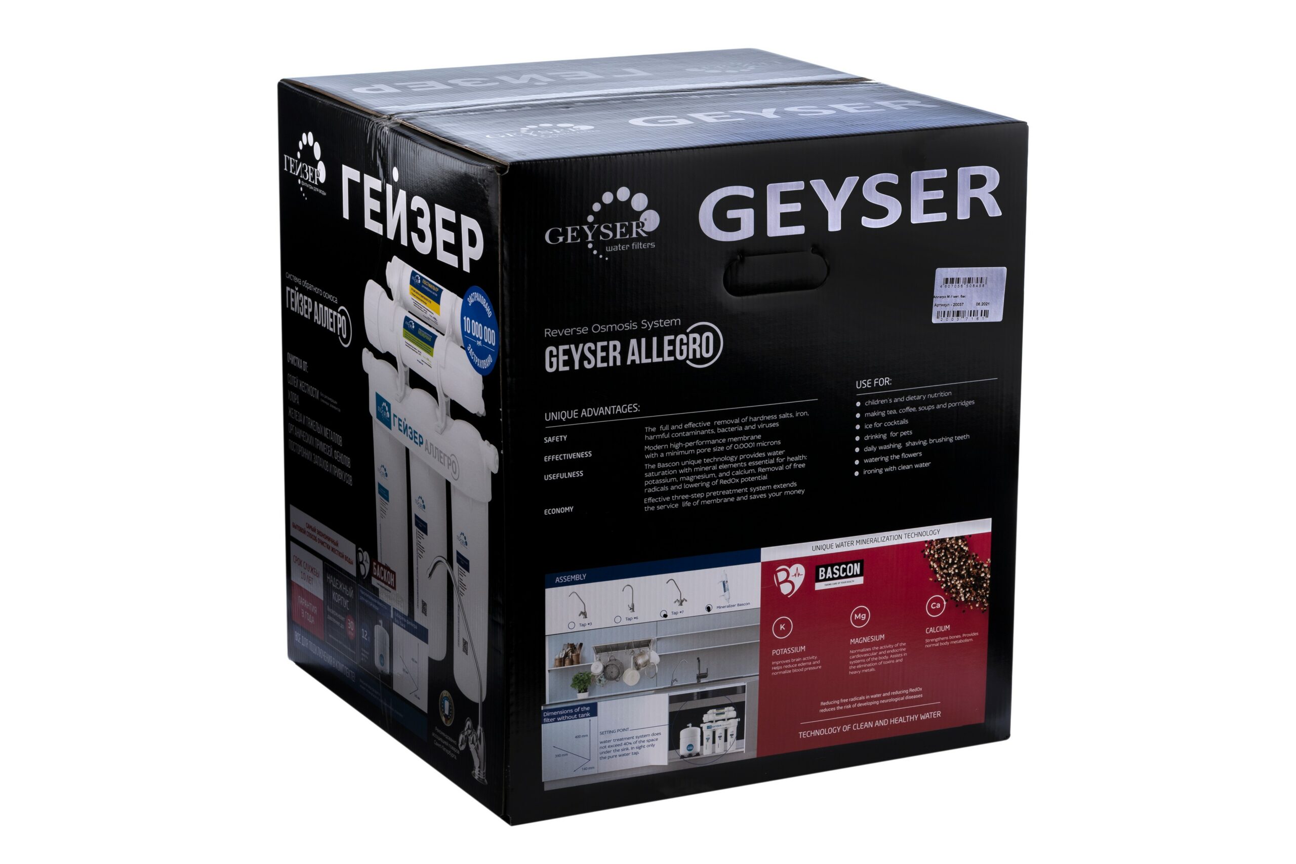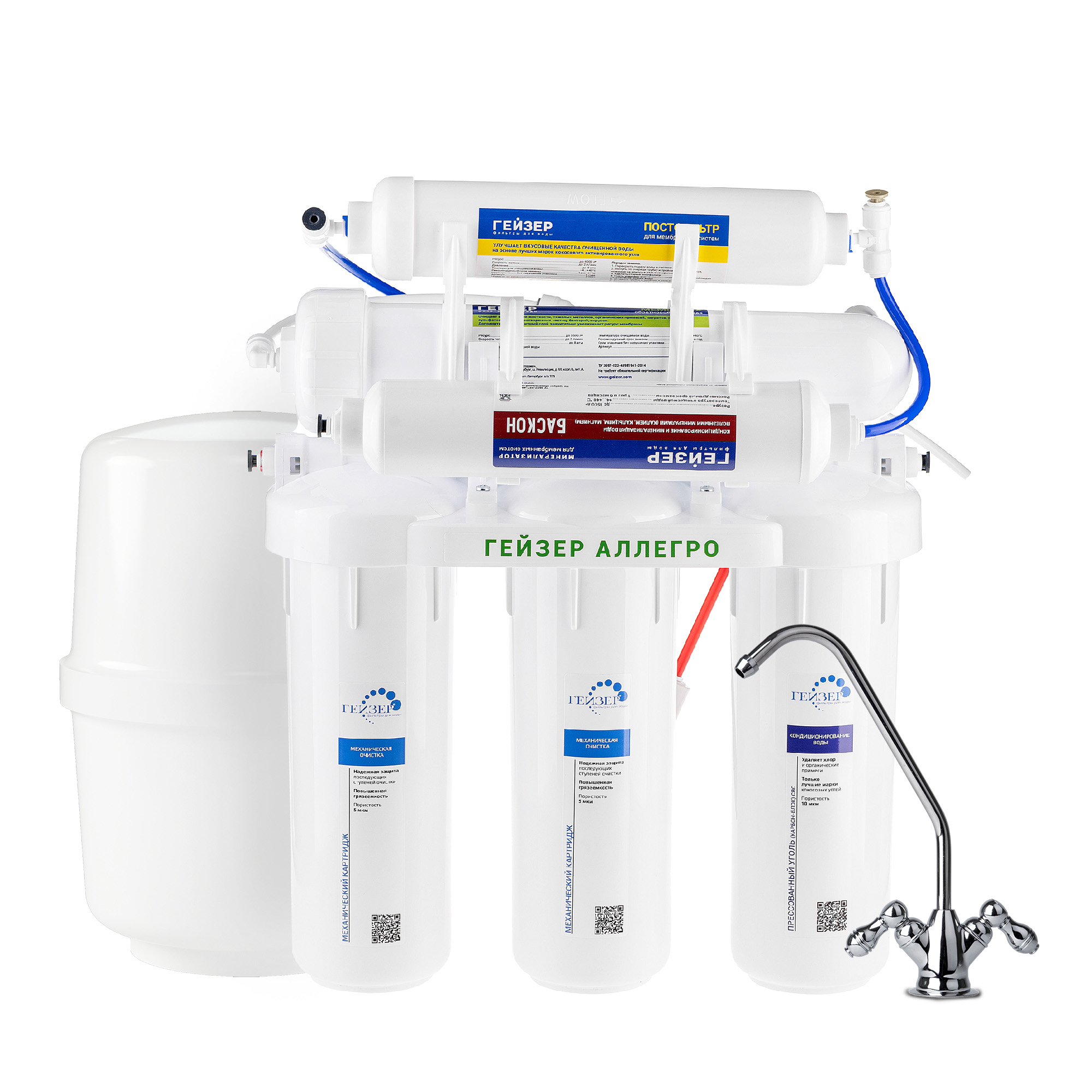 Система обратного осмоса ГЕЙЗЕР Аллегро-М (209460311) используется для глубокой очистки водопроводной воды методом обратного осмоса от солей жесткости, тяжелых металлов, механических примесей, хлора и органических соединений, фенолов, бактерий и вирусов. Система устраняет из воды посторонний привкус, запах и цвет. Система укомплектована двухклавишным краном. Деминерализованная жидкость используется для парогенератора, утюга, увлажнителя воздуха, при заваривании чая и кофе, приготовлении льда. Обогащенная минералами вода полезна для питья и приготовления пищи. Для установки в напорной сети колбы имеют двойное уплотнение. Корпус выдерживает давление в 25 атмосфер и не менее 100 тысяч циклов гидроудара. Предусмотрен специальный клапан сброса воды в дренаж при сверхнормативном давлении в гидроаккумуляторе. Для продления срока службы мембраны и удаления примесей на ранней стадии фильтрации используется трехступенчатая предочистка. Чтобы очищенная вода не осталась без полезных человеку природных элементов, фильтр “Гейзер Аллегро М” оснащен дополнительным блоком минерализации. Для обогащения магнием, кальцием, а также необходимыми микроэлементами в оптимальной для организма концентрации используются природный магнетит и кальцит из экологически безопасных месторождений.