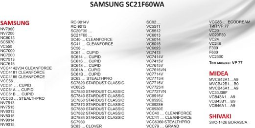 | Совместимая модель пылесоса | Samsung F300, Samsung F600, Samsung NC7000, Samsung NC7200, Samsung NC7513, Samsung NC7515, Samsung NC8013, Samsung NV7000, Samsung NV7200, Samsung NV7513, Samsung NV7515, Samsung NV8013, Samsung NV8015, Samsung NV9014, Samsung NV9015, Samsung RC9014V, Samsung RC9015, Samsung SC20F30*, Samsung SC21F60*, Samsung SC21F60JD, Samsung SC21F60WA, Samsung SC21F60YG, Samsung SC40*, Samsung SC41*, Samsung SC56*, Samsung SC61*, Samsung SC6100, Samsung SC614*, Samsung SC6140, Samsung SC6141, Samsung SC6142, Samsung SC616*, Samsung SC6160, Samsung SC6161, Samsung SC6162, Samsung SC6163, Samsung SC6179, Samsung SC618*, Samsung SC6185, Samsung SC6189, Samsung SC61A*, Samsung SC61A0, Samsung SC61A0V3R, Samsung SC61A1, Samsung SC61B*, Samsung SC61B1H3B, Samsung SC61B2H3K, Samsung SC61B3, Samsung SC61B4, Samsung SC61B4H3B, Samsung SC61B5, Samsung SC6260, Samsung SC63*, Samsung SC6340, Samsung SC6360, Samsung SC6367, Samsung SC6368, Samsung SC6375, Samsung SC7820, Samsung SC7830, Samsung SC7840, Samsung SC7850, Samsung SC7870, Samsung SC7880, Samsung SC7882, Samsung SC7884, Samsung SC7930, Samsung SC83*, Samsung SC92*, Samsung SC9271, Samsung SC9273, Samsung VC20, Samsung VC20F30, Samsung VC20F30WNAR, Samsung VC20F30WNCN, Samsung VC20F30WNEL, Samsung VC21F60JUK1, Samsung VC21F60WNJP, Samsung VC24, Samsung VC246, Samsung VC24FHNJGWQ, Samsung VC24GHNJGBK, Samsung VC24JVNJGBJ, Samsung VC24LVNJGBB, Samsung VC550, Samsung VC5511, Samsung VC5512, Samsung VC6013, Samsung VC6014, Samsung VC6015, Samsung VC6023, Samsung VC6025, Samsung VC7413, Samsung VC7414V, Samsung VC7415V, Samsung VC7615V, Samsung VC7616VN, Samsung VC7714V, Samsung VC7715H, Samsung VC7716V, Samsung VC7725H, Samsung VC7727VN, Samsung VC8916V, Samsung VC8926E, Samsung VC8928E, Samsung VC8930E, Samsung VCC40*, Samsung VCC4034V3B, Samsung VCC41*, Samsung VCC4130, Samsung VCC4131, Samsung VCC4140, Samsung VCC4141, Samsung VCC4142V34, Samsung VCC4180V3W, Samsung VCC4181, Samsung VCC4185, Samsung VCC56*, Samsung VCC5610S3A, Samsung VCC5620, Samsung VCC5630, Samsung VCC5640, Samsung VCC5660V3K, Samsung VCC5670, Samsung VCC61*, Samsung VCC6161, Samsung VCC61A*, Samsung VCC61A1, Samsung VCC61A1V3R, Samsung VCC61B*, Samsung VCC61B4H3B, Samsung VCC61B5H3K, Samsung VCC63*, Samsung VCC6340, Samsung VCC6360, Samsung VCC79*, Samsung VCC7930, Samsung VCC7930V3K, Samsung VCC7970, Samsung VCC7980, Samsung VCC83*, Samsung VCC8300, Samsung VCC8340, Samsung VCJG24GH, Samsung VCJG24JV, Samsung VCJG24KV, Samsung VCJG24LV |