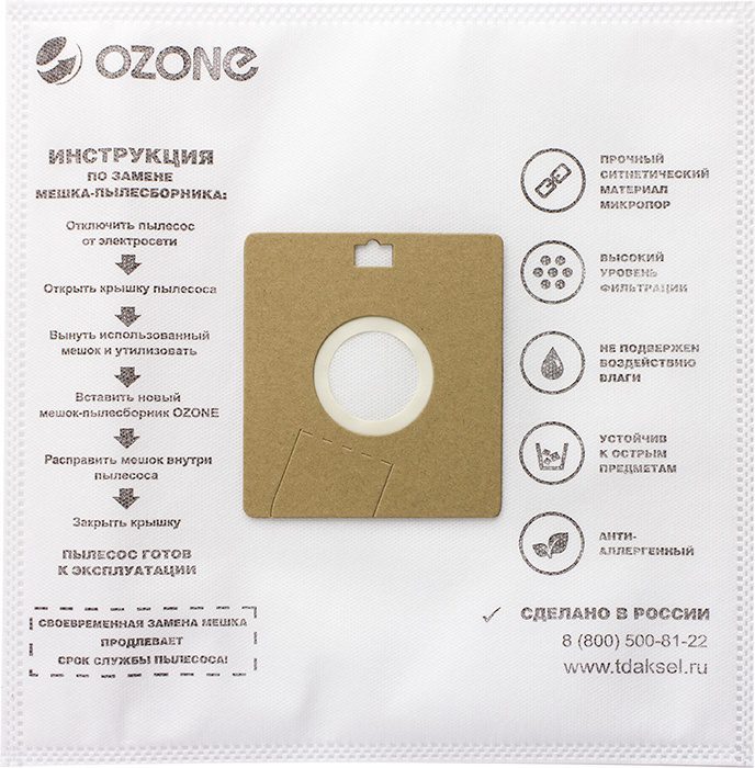 Мешок для пылесоса OZONE для Samsung 3 штуки (SE-03) – одноразовый синтетический пылесборник для моделей пылесосов Samsung, Midea, Shivaki. Изготовлен из уникального материала МИКРОПОР, гарантирующего высокий уровень фильтрации и надежную защиту двигателя. Продлевает срок службы пылесоса в 2 раза. Армированный слой обеспечивает дополнительную прочность, что позволяет собирать все виды мусора, в том числе стекла, гвозди, строительный мусор. Размер 37х26х1,5 см.
