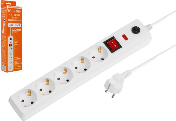 Сетевой фильтр 3 м 5 розеток 2,2 кВт белый ЮПИТЕР (JP8501-01) изготовлен только из качественных материалов в соответствии с ГОСТ60884-1 и рекомендуется для подключения дорогостоящего и чувствительного оборудования (компьютер, холодильник, телевизор, аудио- видео- техника, оргтехника и др.), у которого нет встроенной защиты. Встроенные элементы обеспечивают надежную защиту подключенных приборов от перенапряжения и импульсных помех. Термовыключатель отключает питание всех розеток от сети при превышении допустимой нагрузки.Провод из чистой меди и контроль производства гарантируют реальное сечение провода и работоспособность удлинителя при подключении нагрузки до 2200Вт. Латунная контактная группа для устойчивого электрического контакта между вилкой и розеткой. Выключатель имеет световую индикацию наличия напряжения в сети, а также позволяет одновременно отключить все подключенные приборы. Защитные шторки открываются нажатием только на две одновременно, что обеспечивает надежную защиту от случайного прикосновения к токоведущим частям (защита детей).